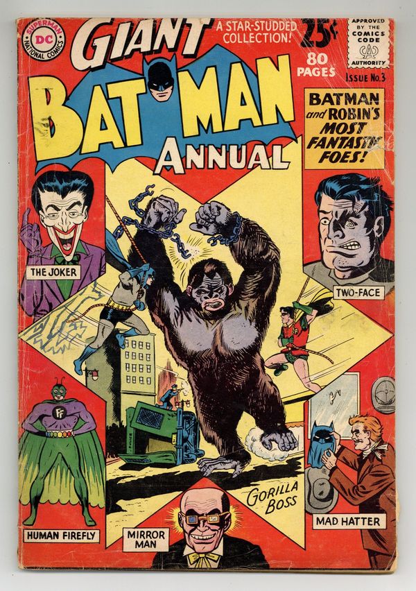 All reprints, with the topic being "Batman and Robin's Most Fantastic Foes!" "The Mad Hatter of Gotham City," script by Bill Finger, pencils by Sheldon Moldoff, inks by Charles Paris; The Mad Hatter has a superb collection of stolen hats, but with Batman's cowl missing it is incomplete. "The Human Firefly," script by Ed (France) Herron, pencils by Dick Sprang, inks by Charles Paris; When theatrical lighting director Garfield Lynns is prevented from staging his first robbery, he makes his escape thanks to the light given off by a firefly; Inspired, he assumes the identity of the costumed criminal, Firefly. "The Mental Giant of Gotham City," script by Edmond Hamilton, pencils by Dick Sprang, inks by Charles Paris; A freak accident gives police janitor Barney Barrow a super advanced brain, he then blackmails the Dynamic Duo into aiding him with his ever more dangerous methods of crime fighting. "The Joker's Aces," script by David Vern, pencils by Lew Sayre Schwartz, inks by Charles Paris; The Clown Prince of Crime recruits some new members for his gang, all of whom are perfectly suited for specific felonies. "The Gorilla Boss of Gotham City," script by David Vern, pencils by Lew Sayre Schwartz, inks by Charles Paris; Executed criminal George 'Boss' Dyke's brain is transplanted into a gorilla's head. "The New Crimes of Two-Face," script by Bill Finger, pencils by Sheldon Moldoff, inks by Charles Paris; Actor Paul Sloane is disfigured in an accident, this unhinges his mind and causes him to turn to crime as the second Two-Face. "The Mysterious Mirror Man," script by Bill Finger, pencils by Sheldon Moldoff, inks by Charles Paris; Ventris, a convict, escapes jail with the help of a broken mirror; He adopts the identity of the Mirror Man and sets out to uncover Batman's secret identity by using his X-Ray Mirror. 84 pgs., full color. Cover price $0.25.