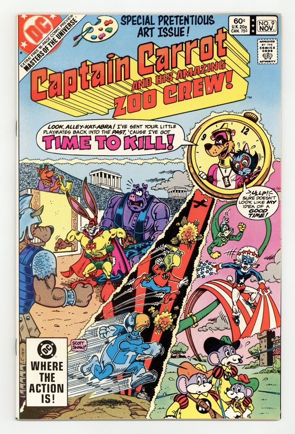 Direct Edition. "Time Varmints!" The Timekeeper sends the The Zoo Crew into the past, where the meet The Terrific Whatzit, The Three Musketeers, Nero Fox, and other funny animals. "Into the Deadly Dimension of Debbil-Dawg!" Alley-Kat-Abra battles Salavador Doggi inside a painting. Script by Roy Thomas and Scott Shaw, pencils by Shaw and Stan Goldberg, inks by Al Gordon. Cover by Shaw. Cover price $0.60.