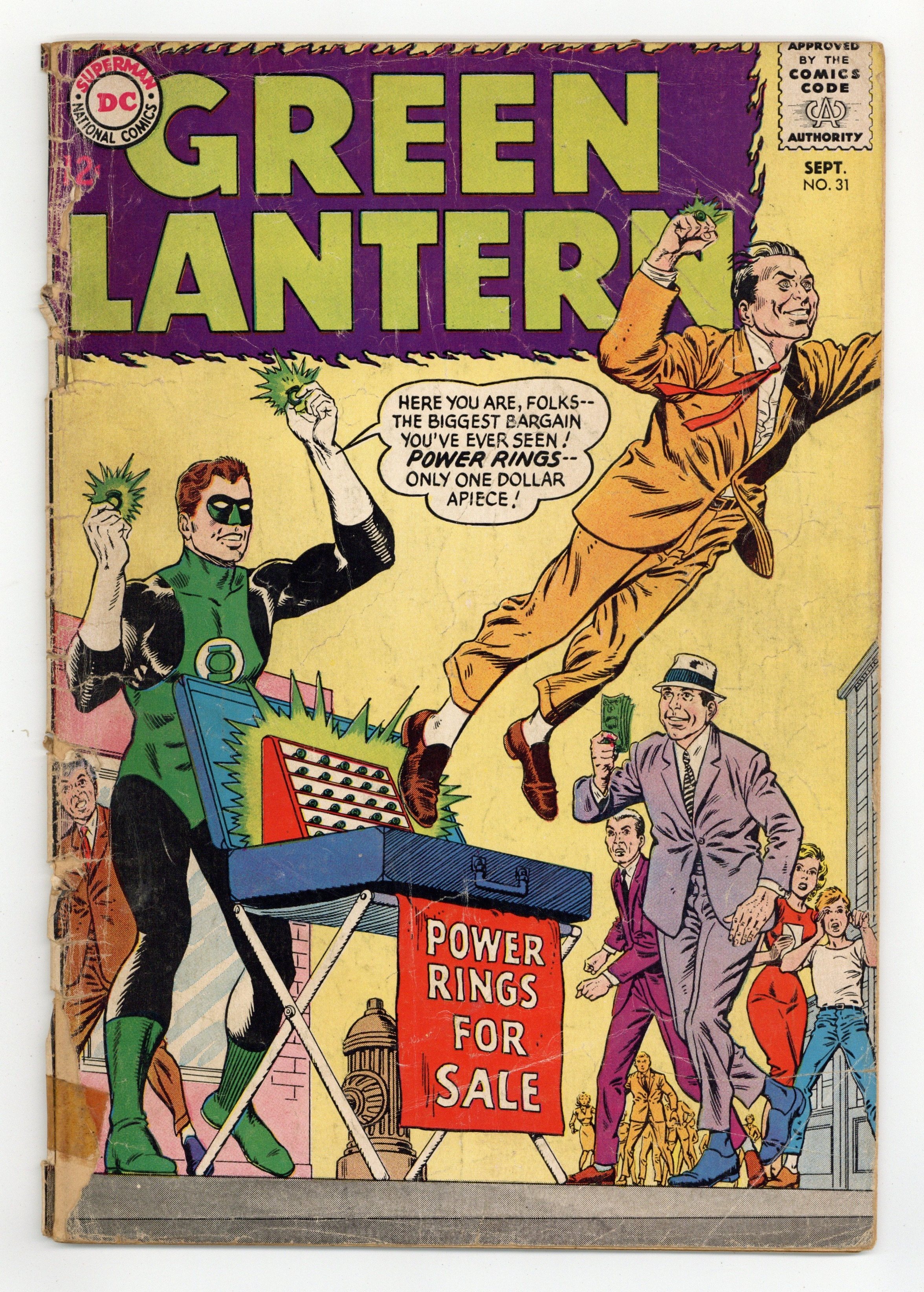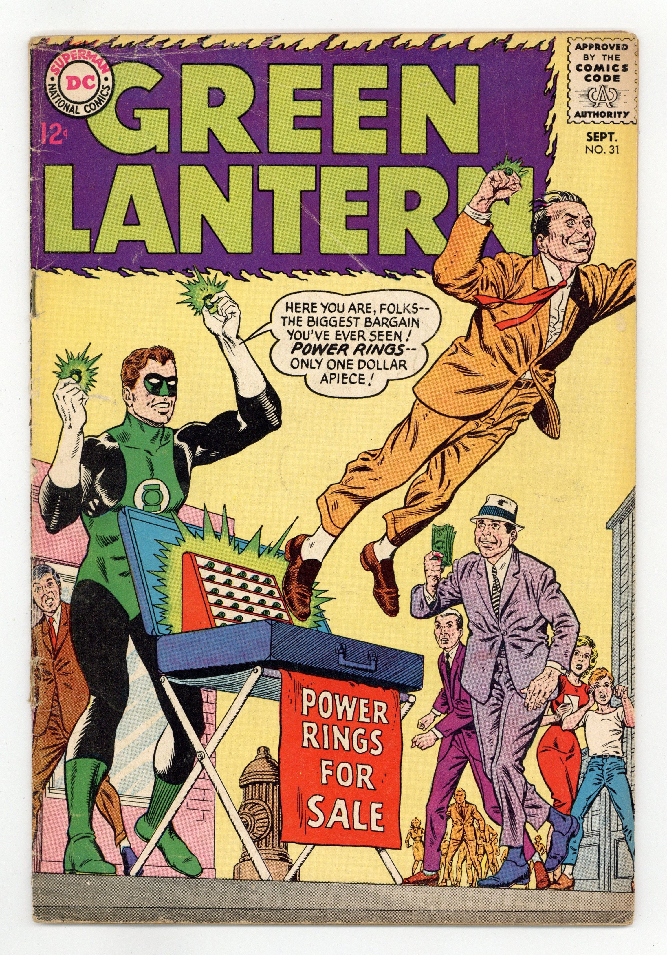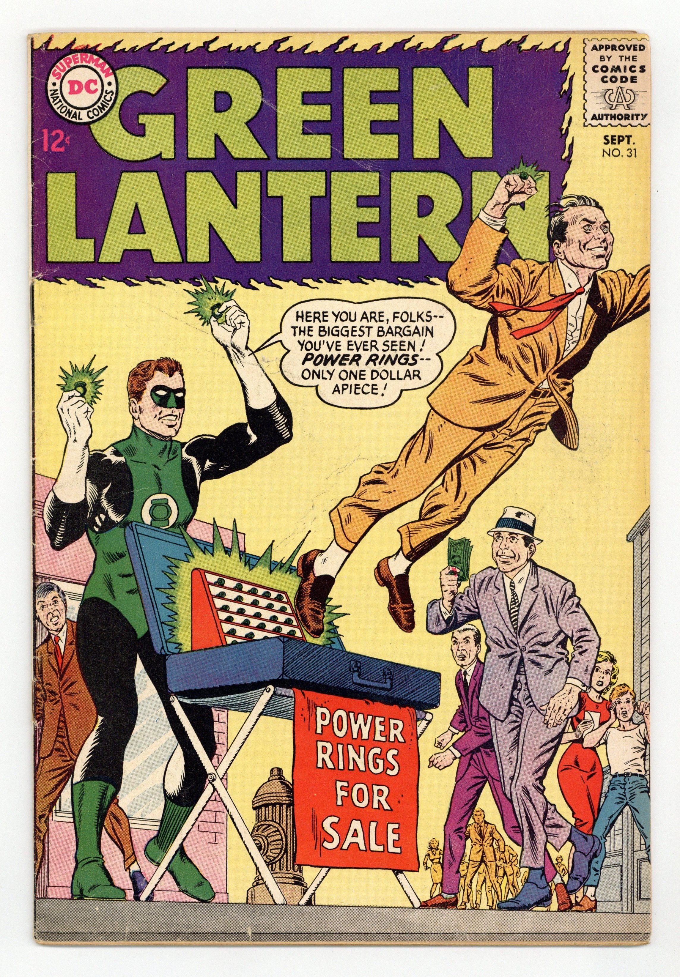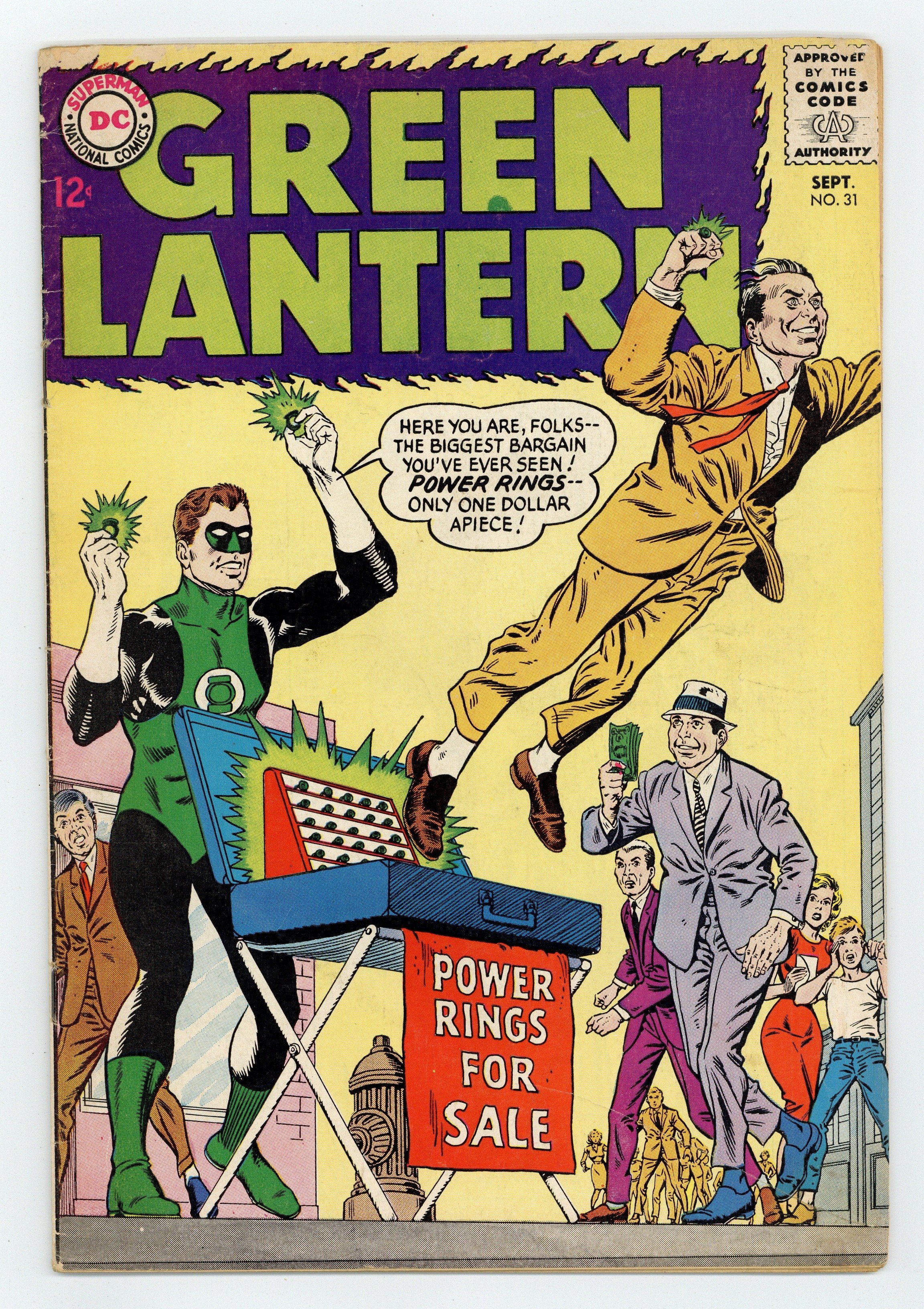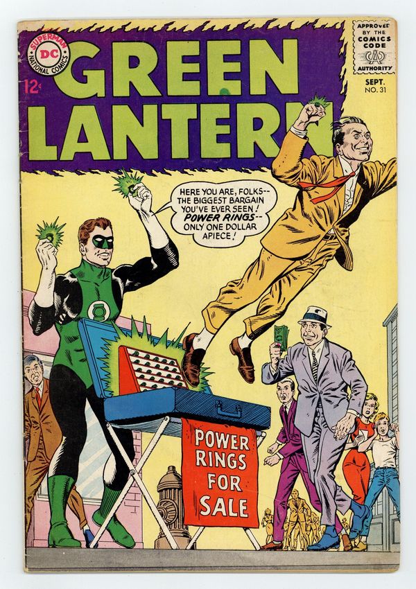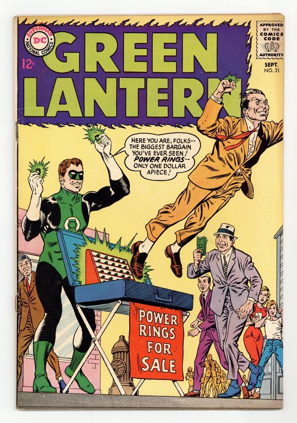 Cover pencils by Gil Kane, inks by Murphy Anderson. Power Rings For Sale, script by John Broome, pencils by Gil Kane, inks by Sid Greene; Green Lantern sells power rings on the street, as a back-up plan against the Grolls. Pay Up--or Blow Up, script by John Broome, pencils by Gil Kane, inks by Sid Greene; After defeating an evil scientist, Jim and Sue get married. 36 pgs. $0.12. Cover price $0.12.