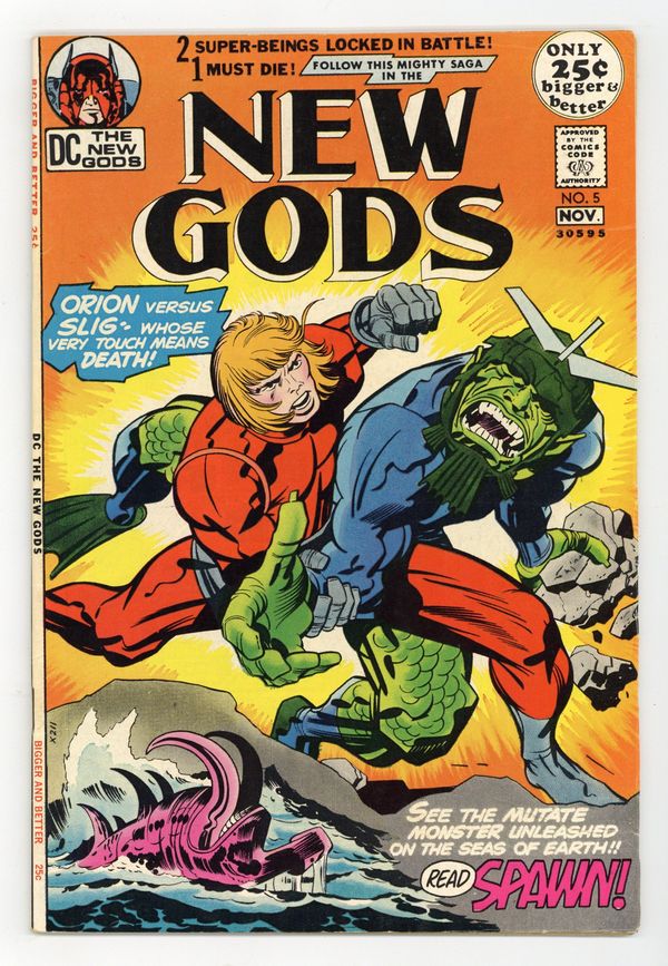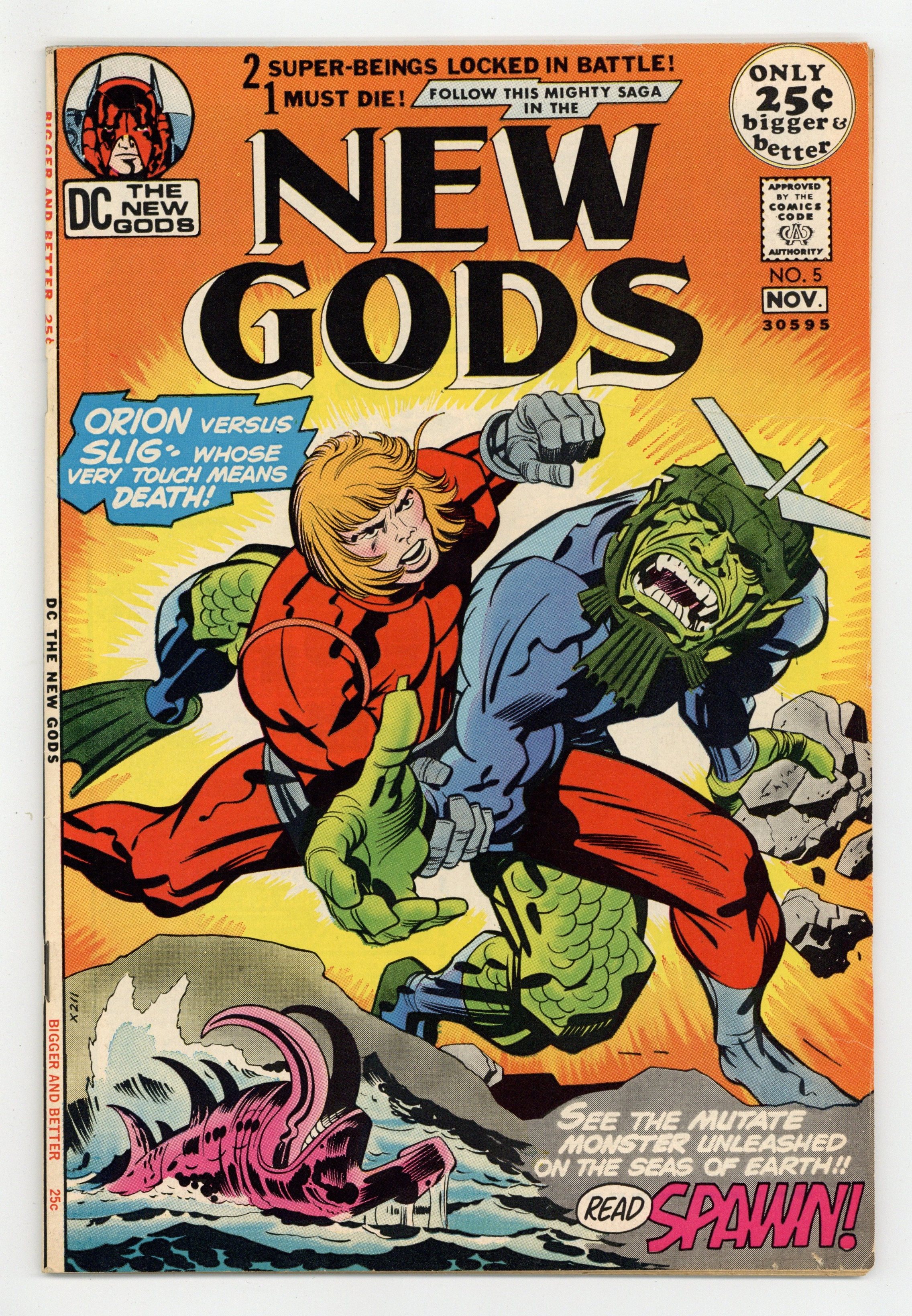 Cover pencils by Jack Kirby, inks by Mike Royer. Spawn, script and pencils by Jack Kirby, inks by Mike Royer; Orion battles Slig and the Deep Six. Kalibak arrives on Earth looking for Orion. Self-portrait of Jack Kirby, who introduces the Manhunter tale. Scavenger Hunt, script and art by Joe Simon and Jack Kirby. Introducing Fastbak, script and pencils by Jack Kirby, inks by Vince Colletta; Fastbak test his Aero-Pads and evades the Monitors. 52 pgs. $0.25. Cover price $0.25.