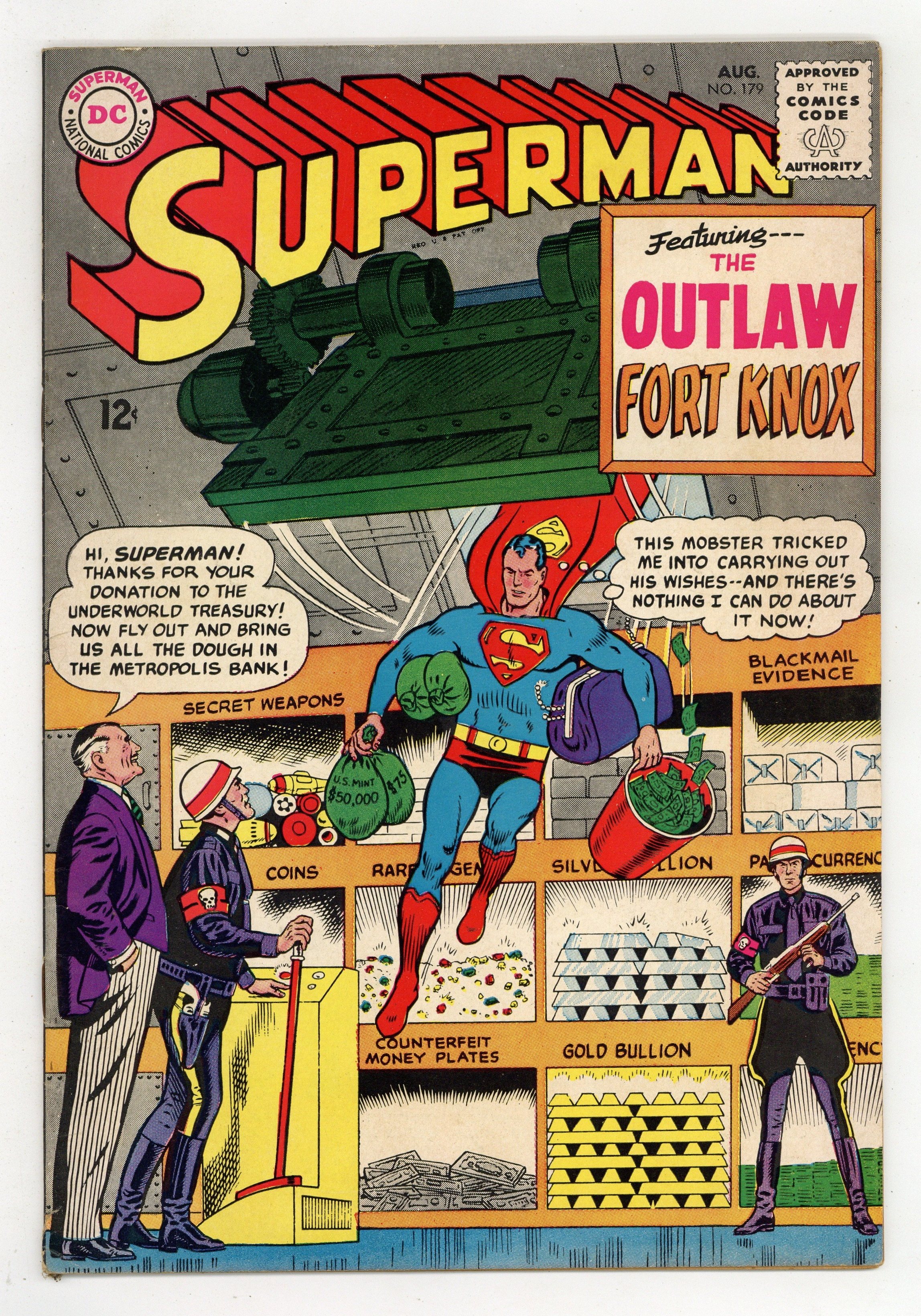 Cover pencils by Curt Swan, inks by George Klein. Summer at Home Can Be Fun, script by Jack Schiff, art by Sheldon Moldoff. The Outlaw Fort Knox!, script by Leo Dorfman, art by Al Plastino; a mobster tricks Superman into stealing. The Menace of Gold Kryptonite! [Tales of Kryptonite No. 4], script by Otto Binder, art by Al Plastino. Private Kent, the Fighting Marine! starring Superman, Sgt. Buck Brewster, and Lois Lane, script by Otto Binder, pencils by Curt Swan, inks by George Klein. Rocky and Bullwinkle star in a one-page Cheerios ad. 36 Pages, Full Color. Cover price $0.12.