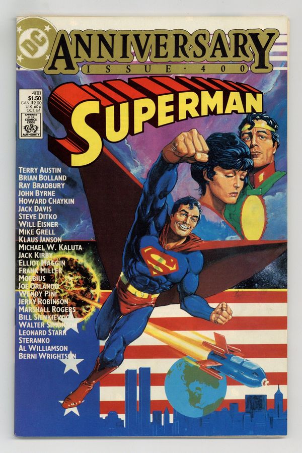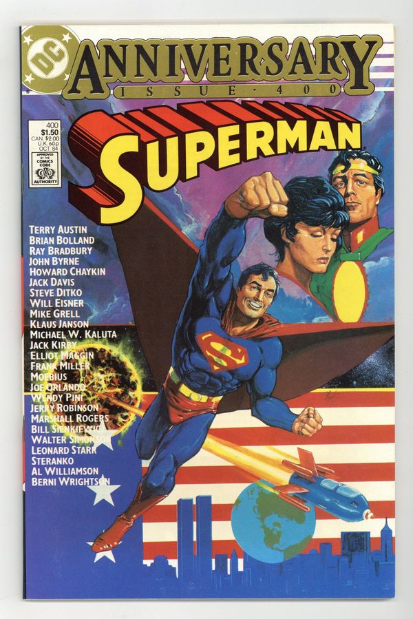 Giant-Sized 400th Anniversary issue! Introduction by Ray Bradbury. How do people look at Superman? How will we see him in the future, as historians and scholars evaluate this figure who so dominated the 20th century? When he is no longer with us...who will we think he was? Come into the future with us to find out and explore..."The Living Legends of Superman." Script by Elliot Maggin. Art by Joe Orlando (4 pages), Al Williamson (8 pages), Frank Miller (4 pages), Marshall Rogers & Terry Austin (7 pages), Wendy Pini (3 pages), Michael W. Kaluta & Kelly Alder (6 pages), Klaus Janson (10 pages), Jim Steranko (10 pages, and Steranko also handles the script, letters & colors for his sequence). Pin-ups by: Brian Bolland, Jack Kirby & Terry Austin, John Byrne, Jack Davis, Leonard Starr (Superman flying with Annie and Sandy), Walt Simonson, Bernie Wrightson, Will Eisner (Superman and the Spirit), Steve Ditko, Mike Grell, Moebius, Bill Sienkiewicz, Jerry Robinson (Batman, Robin, Joker, Penguin appear in pin-up). Cover by Howard Chaykin. Back cover by Frank Miller. 68 Pages, Full Color. Cover price $1.50.
