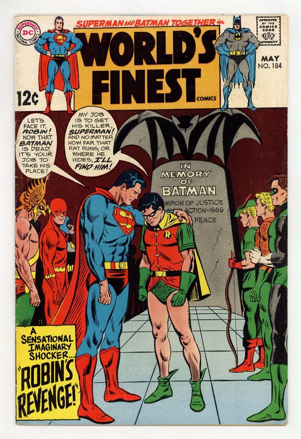 Cover pencils by Curt Swan, inks by Mike Esposito. Robin's Revenge! starring Superman and Batman, script by Cary Bates, pencils by Curt Swan, inks by Jack Abel; After the Automator kills the Batman, Robin devotes the next ten years of his life to hunting down the killer. When the thief dubbed Golden Gloves starts operating using technology strikingly similar to the Automator's, Superman and Robin investigate and discover that Golden Gloves isn't the Automator, but a brainwashed Batman, who was actually teleported away ten years ago by the Automator, whom they finally bring to justice. Description of the first Batman story in Detective Comics #27. John Jones' Farewell to Earth starring the Martian Manhunter, art by Joe Certa; J'onn J'onzz meets a team of security officers from Jupiter who are seeking S'Vor, an escaped criminal on Earth. 36 Pages, Full Color. Cover price $0.12.