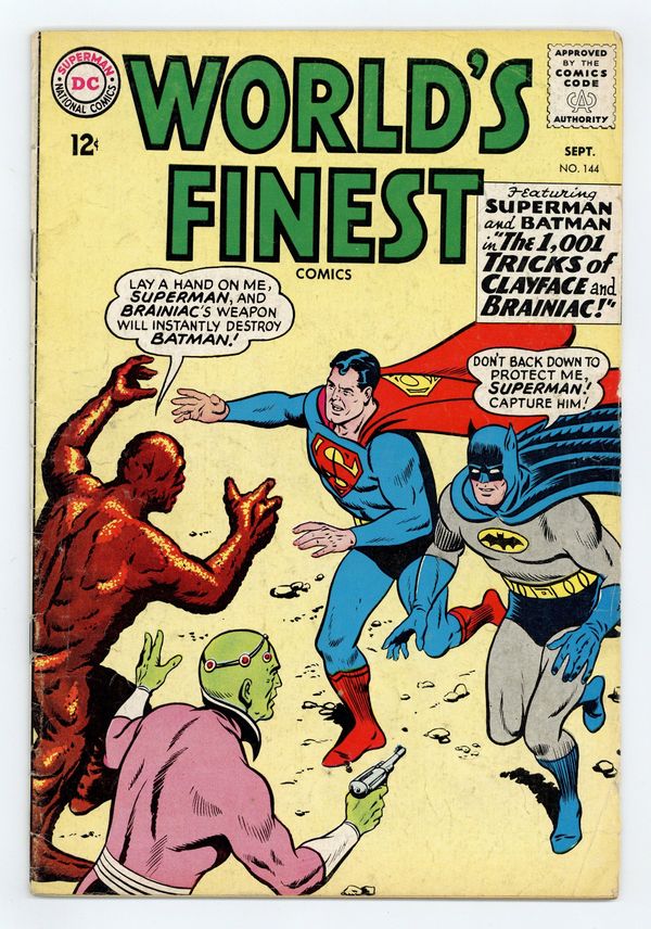 Tags: Superman$22.00Cover pencils by Curt Swan, inks by George Klein. The 1,000 Tricks of Clayface and Brainiac! starring Superman and Batman, script by Edmond Hamilton, pencils by Curt Swan, inks by George Klein; Braniac and Clayface team up against Superman and Batman; Robin works with Superman and Jimmy Olsen works with Batman. How Superman and Batman Learned Each Other's Secret Identities text story. The Manhunt On Land! starring Aquaman, script by Robert Bernstein, art by Ramona Fradon; The Shark and The Wizard escape from jail; The Shark decides to operate on land but Aquaman captures him anyway. Ollie humor page by Henry Boltinoff. 36 Pages, Full Color. Cover price $0.12.