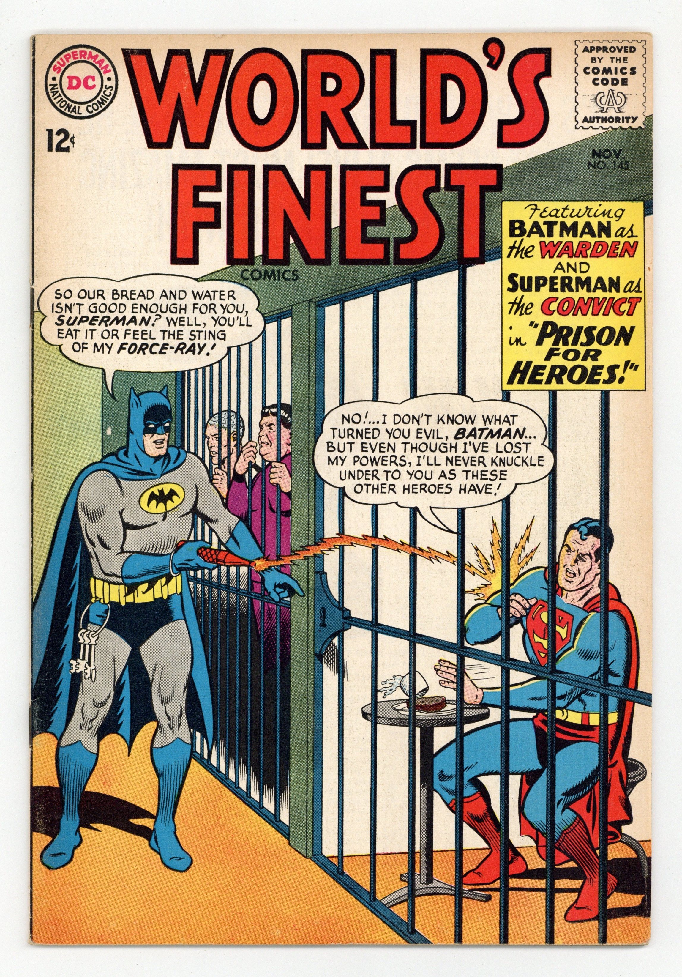 Cover pencils by Curt Swan, inks by George Klein. Prison For Heroes! starring Superman and Batman, script by Edmond Hamilton, pencils by Curt Swan, inks by George Klein; Batman is hypnotized into becoming the warden of an alien prison and charged with capturing Superman and imprisoning him with the other heroes inside. Honesty IS the Best Policy public service announcement, script by Jack Schiff, art by Sheldon Moldoff. House ad for 80 Page Giant Magazine #4, pencils by Carmine Infantino, inks by Murphy Anderson. Part II-The Revenge Of Superman!, script by Edmond Hamilton pencils by Curt Swan, inks by George Klein; Superman escapes from the prison and takes revenge on Batman; So the aliens from the planet Vor come down to try to regain control of their prison plan to conquer the universe. The Underwater Archers! starring Green Arrow, script by Robert Bernstein, art by Lee Elias; Green Arrow battles his old foe The Wizard underwater. 36 Pages, Full Color. Cover price $0.12.