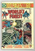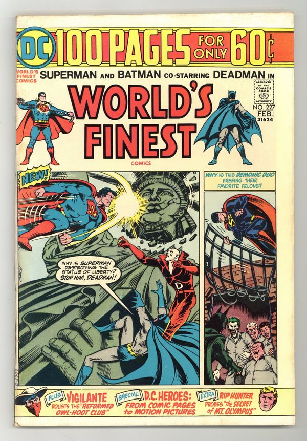 100-page giant. Cover pencils by Carmine Infantino (layout) and Nick Cardy, inks by Nick Cardy. Death Flaunts Its Golden Grin starring Superman and Batman, script by Bob Haney, pencils by Dick Dillin, inks by Tex Blaisdell. The Secret of Mount Olympus starring Rip Hunter, script by Jack Miller, art by Bill Ely (reprinted from Rip Hunter 11). The Reformed Owlhoot Club! starring Vigilante, script by Dick Wood, art by Howard Sherman (from Action 188). The Man With 20 Lives starring Martian Manhunter, script by Jack Miller, art by Joe Certa (from Detective Comics 227). The Cape and Cowl Crooks! starring Superman, Batman, Penguin, and the Joker, script by Edmond Hamilton, pencils by Curt Swan, inks by George Klein (from World's Finest 159). Three-page illustrated article, DC Comics Stars on the Screen (illustrated with an ad for an old Batman serial, "The Mark of the Zombies" and other photos). 100 Pages, Full Color. Cover price $0.60.