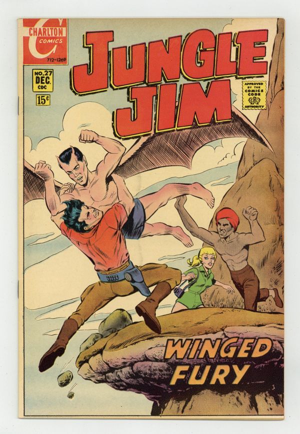 Published Dec 1969 by Charlton Comics Group.$6.00Cover by Sal Gentile. Stories by unknown. Art by Steve Ditko, Mo Marcus, Wally Wood, Vince Alascia and unknown. Jungle Jim stars in three stories with art by Steve Ditko and Wally Wood: "Reptile God of Lost Island"; "The Beast Man and the Man Beast"; and "Winged Fury"! Plus: Back-up story "The Elephant Graveyard" with art by Mo Marcus and Vince Alascia; Jungle People 1-pager "The Enemies"; and a language lesson in the 1-page text piece "Lesson 4: Kiswahili Somo La Tano" by Mwalimu Bahati Njema. 36 pages, full color. Cover price $0.12.