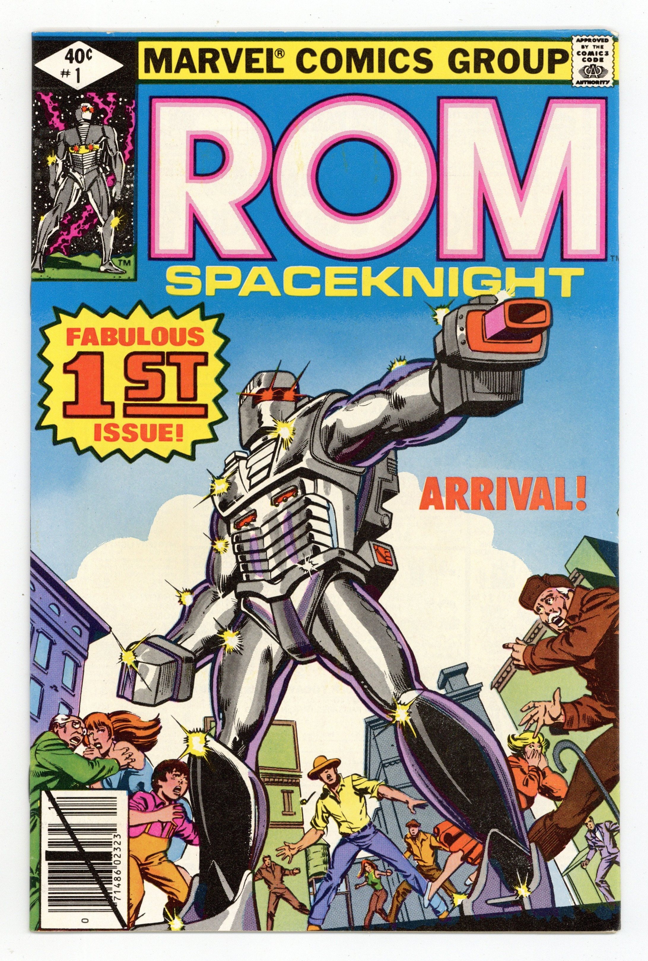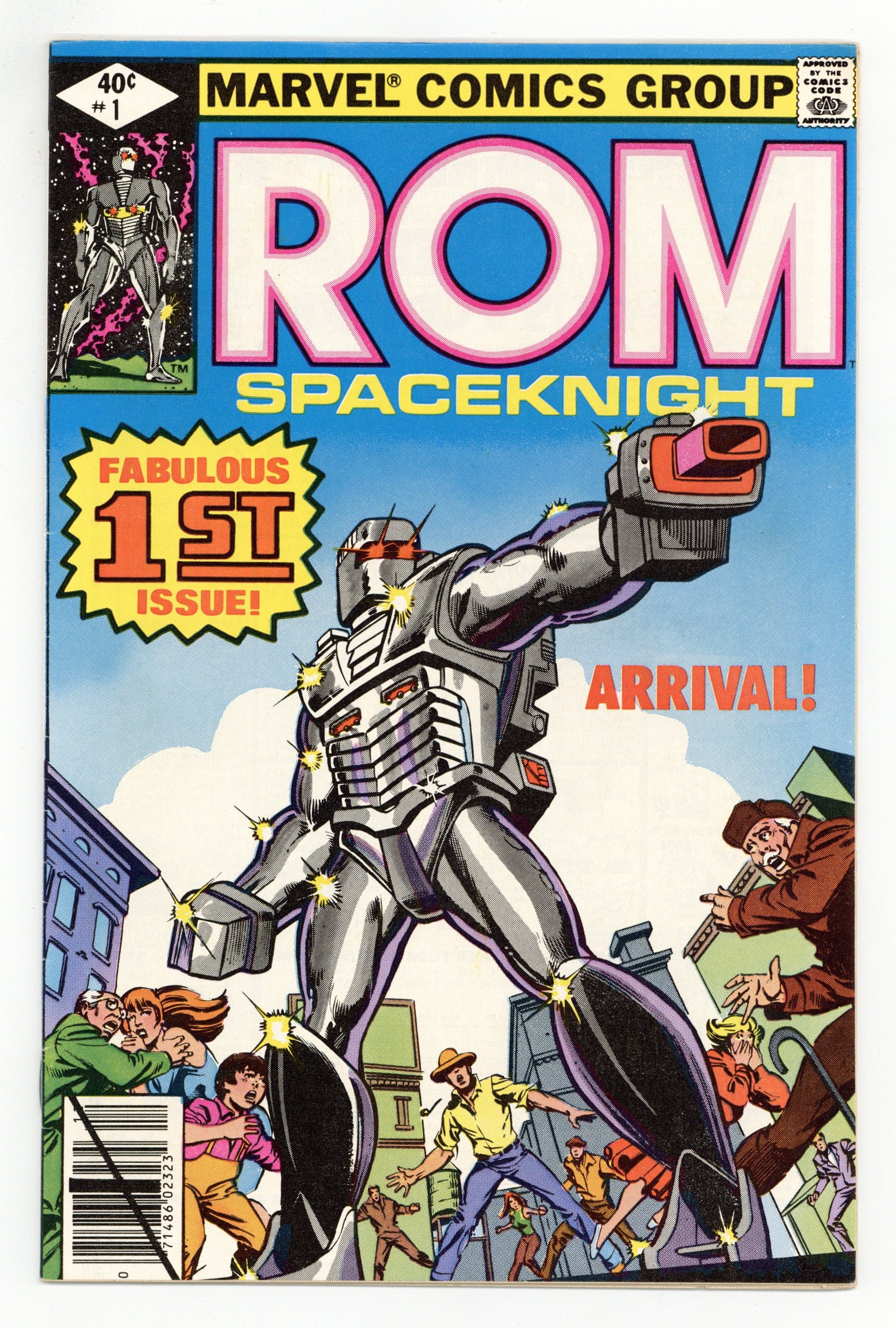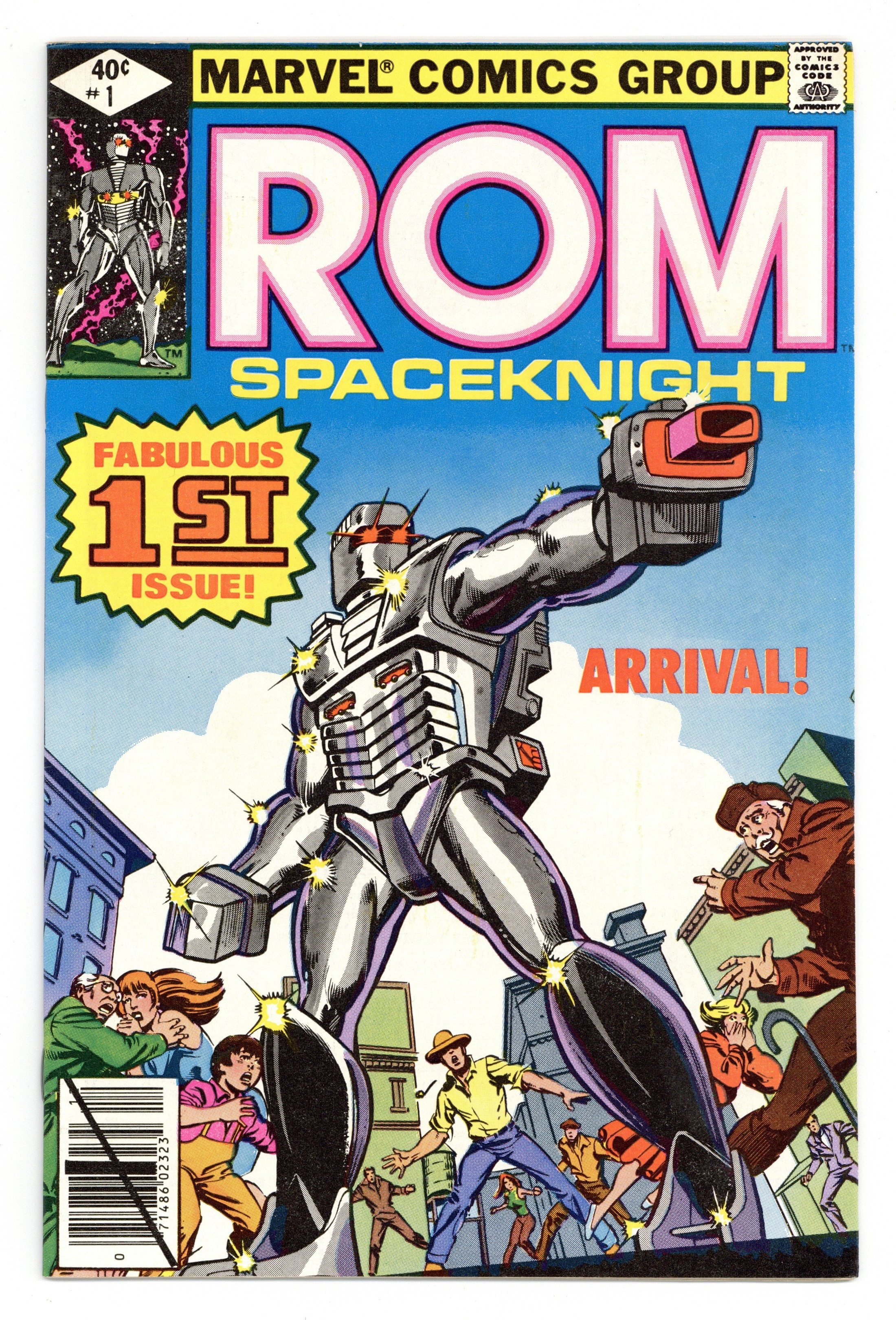 Tags: ROM Spaceknight$21.00Direct Edition. Story by Bill Mantlo. Art by Sal Buscema. Frank Miller cover. Deep in space two centuries ago a decisive battle between the forces of good and evil was fought. The brave Spaceknights of Galador defeated the evil sorcery and super-science of the Dire Wraiths and scattered them to the furthest reaches of the galaxy. Now in present day their eternal struggle has spilled over to Earth. Rom, greatest of the Spaceknights, has arrived in Clairton, a small West Virginia town. Frightened by the arrival of a 7' alien, the people of Clairton have called in the National Guard. Can Rom convince those he came to save that the true enemy resides in their very ranks? 32 pages. Cover price $0.40.