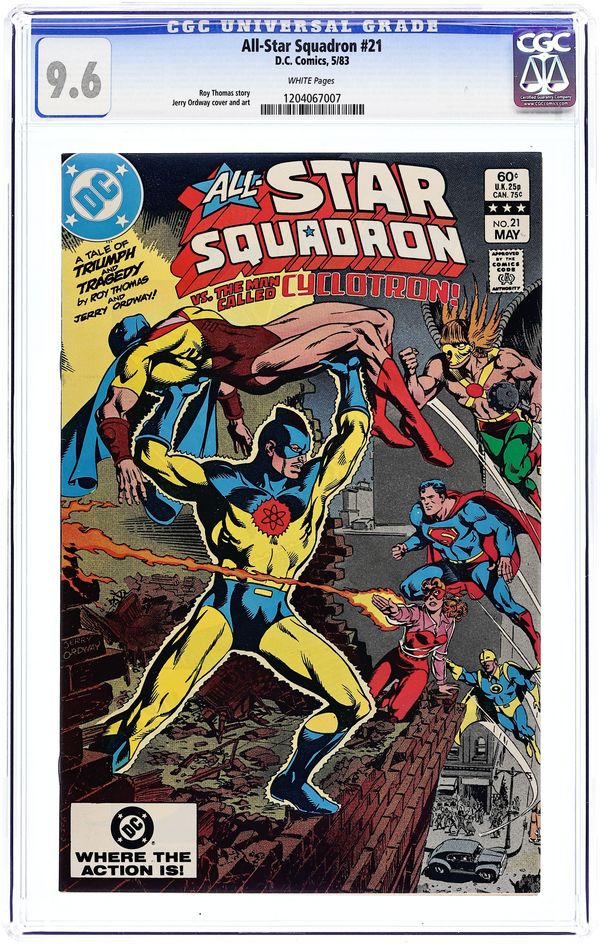 Cover art by Jerry Ordway. A Tale of Three Citadels!, script by Roy Thomas, pencils by Jerry Ordway, inks by Mike Machlan; holding the Powerstone he took from Lex Luthor, Superman meets the Justice Society; Deathbolt and Cyclotron attack the Squadron after Wonder Woman is voted in as a member. 36 pgs. $0.60. Cover price $0.60.
