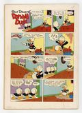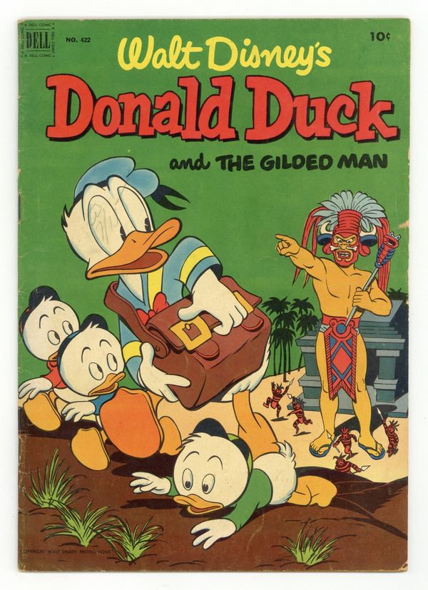 Starts Jan 26 Cover art by Carl Barks. Stable Prices; Scrooge complains about the price at Donald's riding stable. Donald Duck and "The Gilded Man"; The ducks go to British Guiana in search of the world's rarest stamp, a one-cent magenta of 1856, and find it on a letter in the possession of El Dorado, a giant golden Indian; After they retrieve the letter, the ducks learn that it is addressed to a deceased Duckburg resident who named Gladstone her only heir. Armored Cat Rescue; Donald puts on sturdy clothing to bring Daisy's cat down from a telephone pole. All scripts and art by Carl Barks. 36 pages, full color. Cover price $0.10.