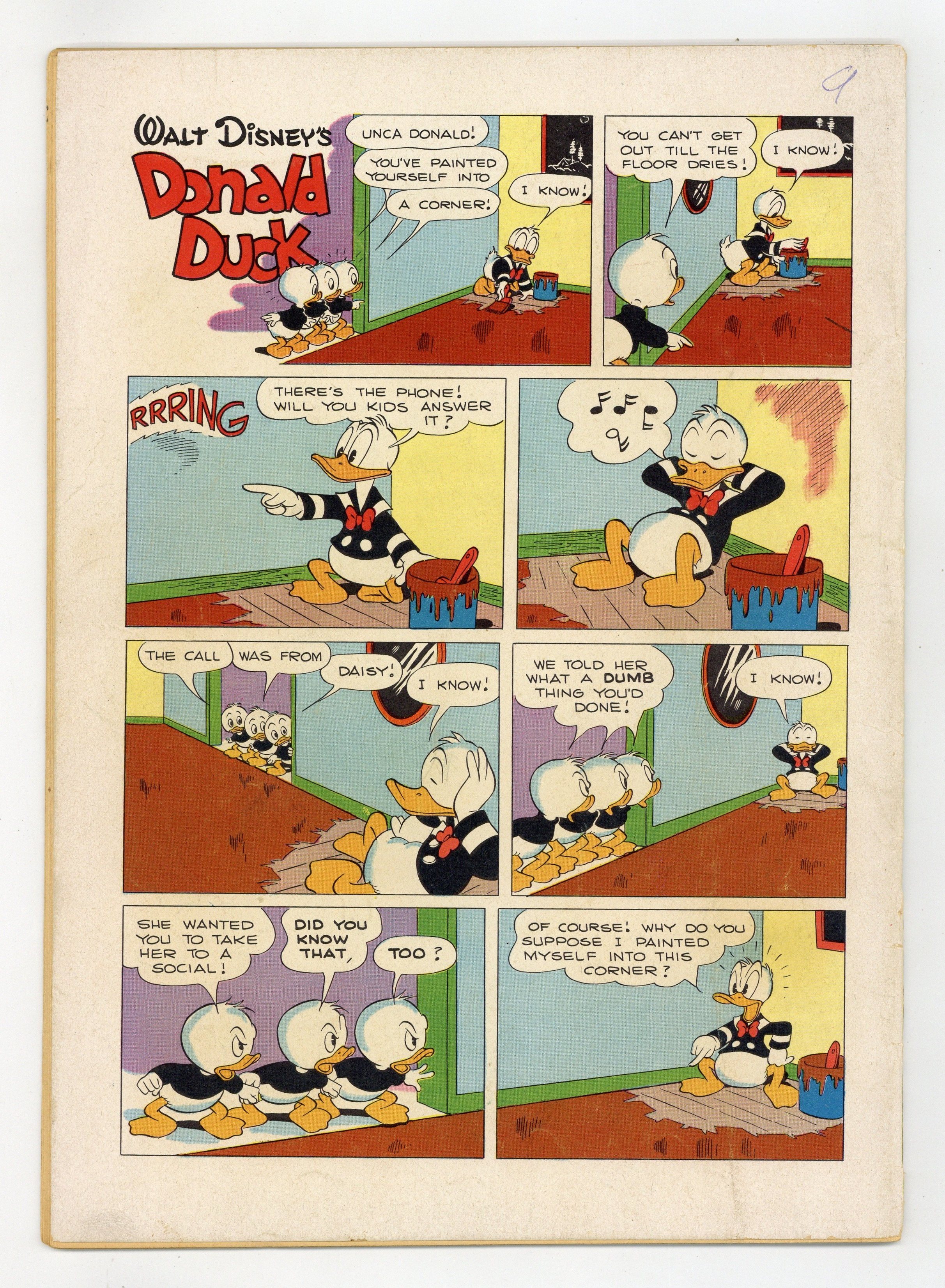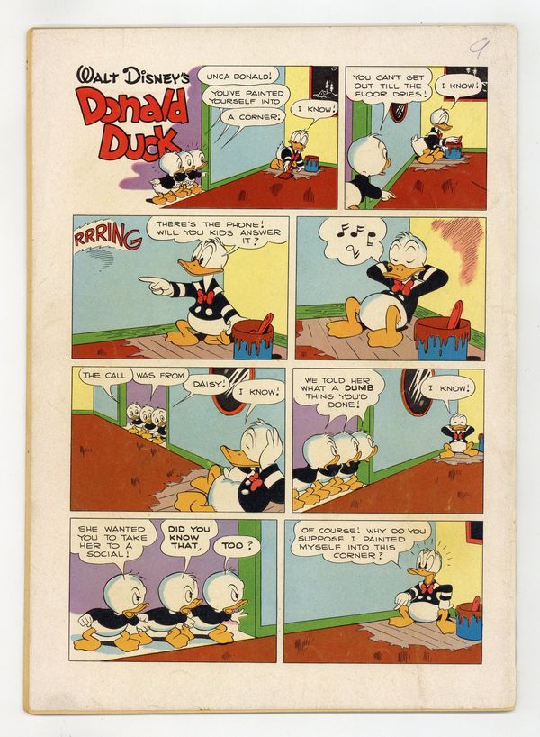 Cover art by Carl Barks. Stable Prices; Scrooge complains about the price at Donald's riding stable. Donald Duck and "The Gilded Man"; The ducks go to British Guiana in search of the world's rarest stamp, a one-cent magenta of 1856, and find it on a letter in the possession of El Dorado, a giant golden Indian; After they retrieve the letter, the ducks learn that it is addressed to a deceased Duckburg resident who named Gladstone her only heir. Armored Cat Rescue; Donald puts on sturdy clothing to bring Daisy's cat down from a telephone pole. All scripts and art by Carl Barks. 36 pages, full color. Cover price $0.10.