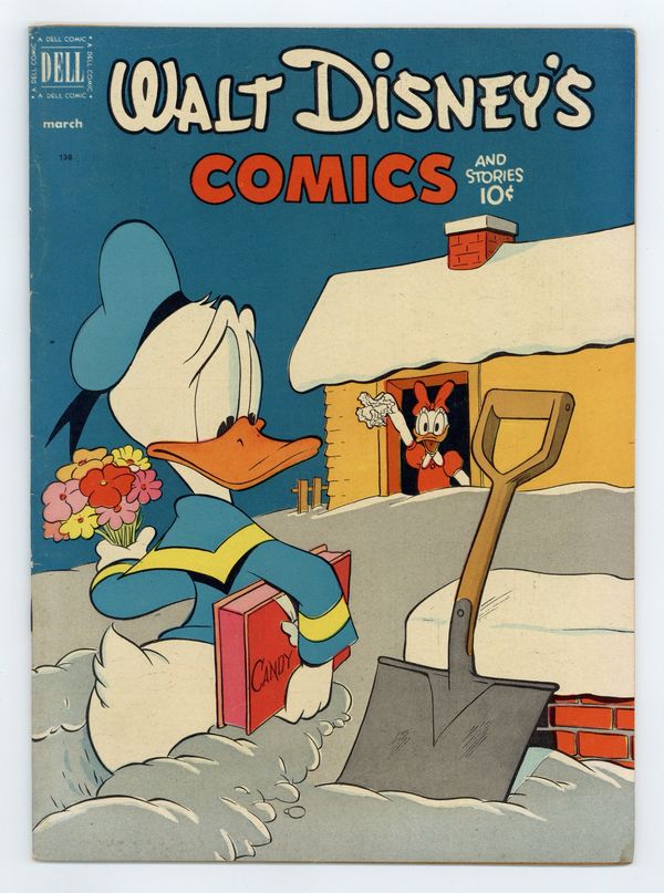 Cover by Carl Barks. Stories and art by Carl Barks, Stan Walsh, Bob Karp, Gil Turner, and Al Taliaferro. Sometimes listed as Vol. 12 #6. The long-running vehicle for Disney character comics featured art by Carl Barks, the legendary Good Duck Artist. Mickey helps Shamrock Bones and Chief O'Hara investigate the Shattered-Glass Mystery. In a story by Barks, Uncle Scrooge competes with the Maharajah of Howduyustan to build the biggest statue of Cornelius Coot, the founder of Duckburg. While telling bedtime stories to his nephews, Donald ironically forgets the ending to Snow White. Donald Duck; Li'l Bad Wolf; Grandma Duck; The Magic Spring; Mickey Mouse: The Shattered-Glass Mystery. 32 pages, Full Color. Cover price $0.10.