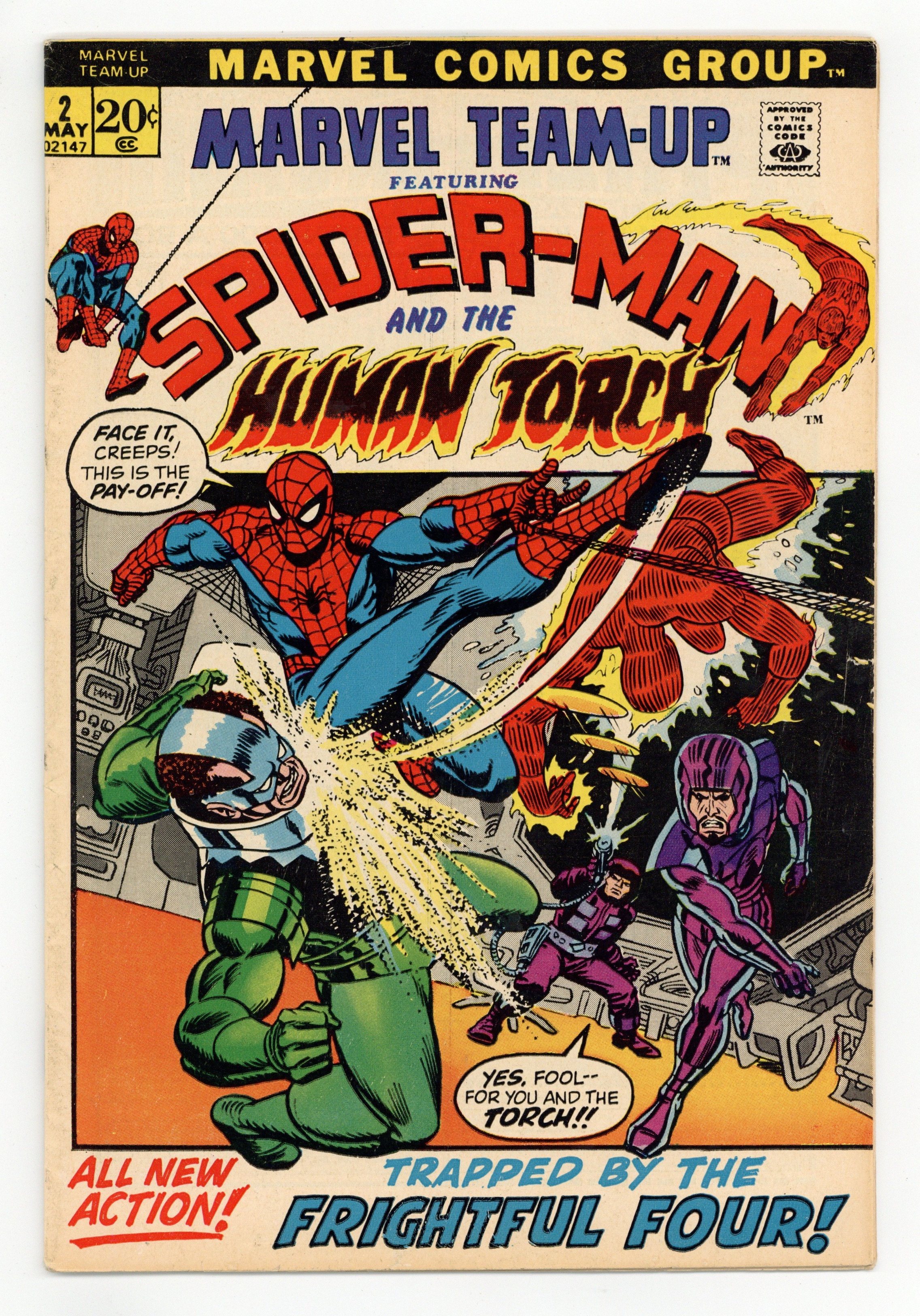 "And Spidey Makes Four!" Guest-starring Spider-Man and the Human Torch. Script by Gerry Conway. Pencils by Ross Andru. Inks by Jim Mooney. Cover by Gil Kane and John Romita. The Frightful Four use an entranced web-slinger to gain access to the Baxter Building. And after subduing the Human Torch, the Wizard tries to tap into the powerful energies of the Negative Zone! But the Wizard, Sandman, and Trapster get much, much more than they bargained for -- when Annihilus bursts thru the Negative Zone portal! Wow! Spider-Man and the Human Torch already had their hands full against the Frightful Four. Can they beat Annihilus too? 36 pages. Cover price $0.20.