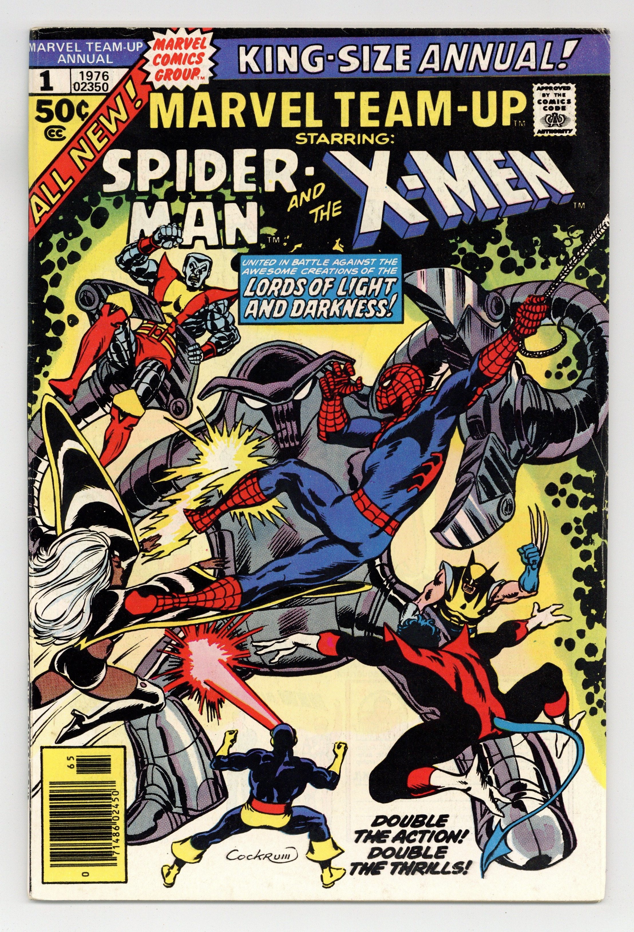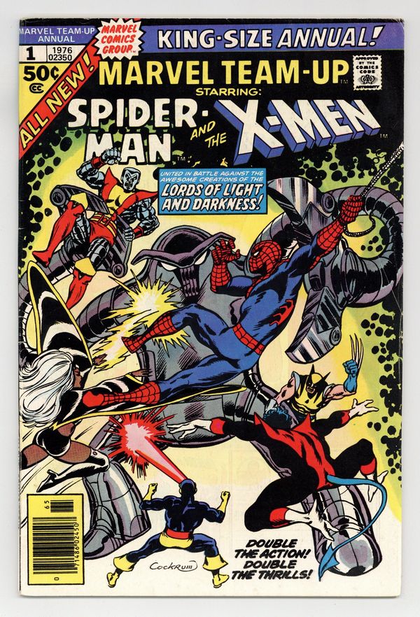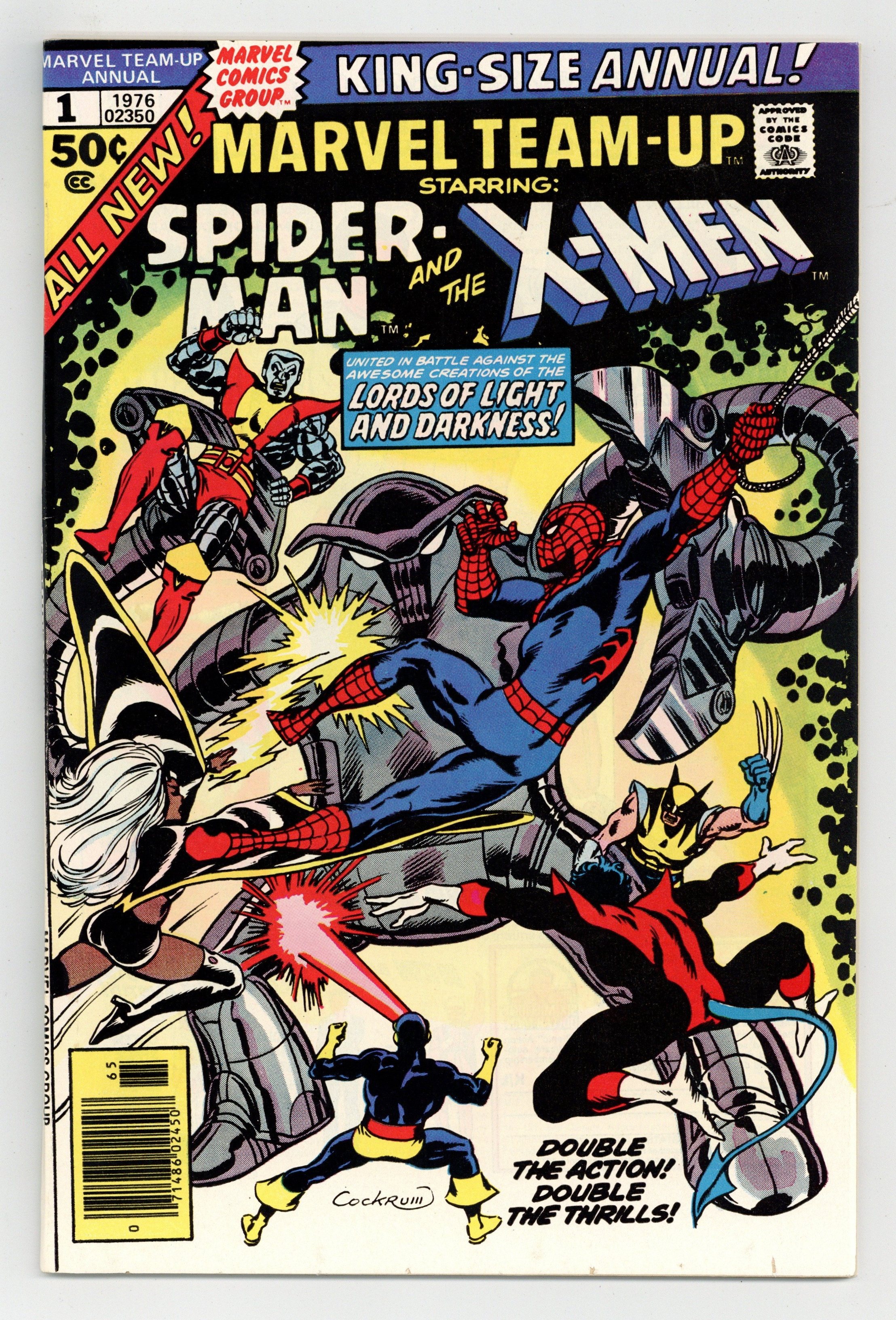 "The Lords of Light and Darkness!" Guest-starring Spider-Man and the X-Men. Plot by Chris Claremont, Bill Mantlo, and Bonnie Wilford. Script by Bill Mantlo. Art by Sal Buscema (breakdowns) and Mike Esposito (finishes). Cover by Dave Cockrum. Something has gone terribly wrong at a top secret government installation in the Nevada desert! Meanwhile in the same vicinity, the World Conference on Man-Made Mutation is taking place onboard a 747 airplane! The Daily Bugle sends a photographer, Peter Parker, to cover the airborne conference; and Professor Xavier and his students are also present to keep an eye on the proceedings! But when a group of robots attacks the plane in mid-air, the Amazing Spider-Man meets the New X-Men for the first time! After safely landing the plane, the heroes discover the source of the problem: an underground "nest" teeming with deadly radiation! However, unbeknownst to the web-slinger and the X-Men, eight mystically-powered beings are waiting down below...and they want the power of Phoenix! Can your friendly neighborhood Spider-Man and the Uncanny X-men beat the Lords of Light and Darkness? And prevent a global meltdown? X-men lineup: Banshee, Colossus, Cyclops, Nightcrawler, Phoenix, Storm, and Wolverine. (Notes: The wall-crawler's southwestern adventure continues in Marvel Team-Up 53. This issue was the first appearance of the New X-Men outside their own title. This story was reprinted in Marvel Tales 235 and 236.) 48 pages Cover price $0.50.