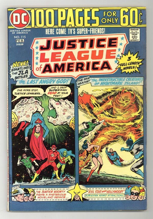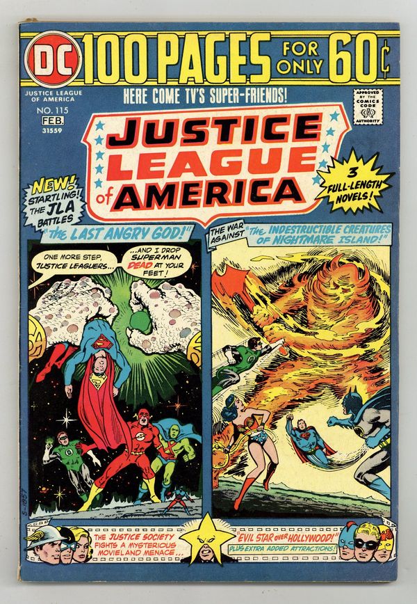96-page giant issue. Cover art by Nick Cardy. The Last Angry God! starring the Justice League, script by Denny O'Neil, pencils by Dick Dillin, inks by Dick Giordano; continues story line on the fate of the Martians from World's Finest #212. Evil Star Over Hollywood! starring the Justice Society, script by Gardner Fox, pencils by Arthur Peddy, inks by Bernard Sachs. Indestructible Creatures of Nightmare Island! starring the Justice League, script by Gardner Fox, pencils by Mike Sekowsky, inks by Bernard Sachs. 96 pgs. $0.60. Cover price $0.60.