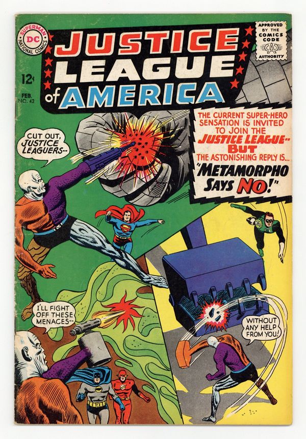 Cover pencils by Mike Sekowsky, inks by Murphy Anderson. Metamorpho Says--NO!, script by Gardner Fox, pencils by Mike Sekowsky, inks by Bernard Sachs; When Metamorpho refuses membership in the JLA, the Unimaginable demands to be admitted in his place. 36 pgs. $0.12. Cover price $0.12.