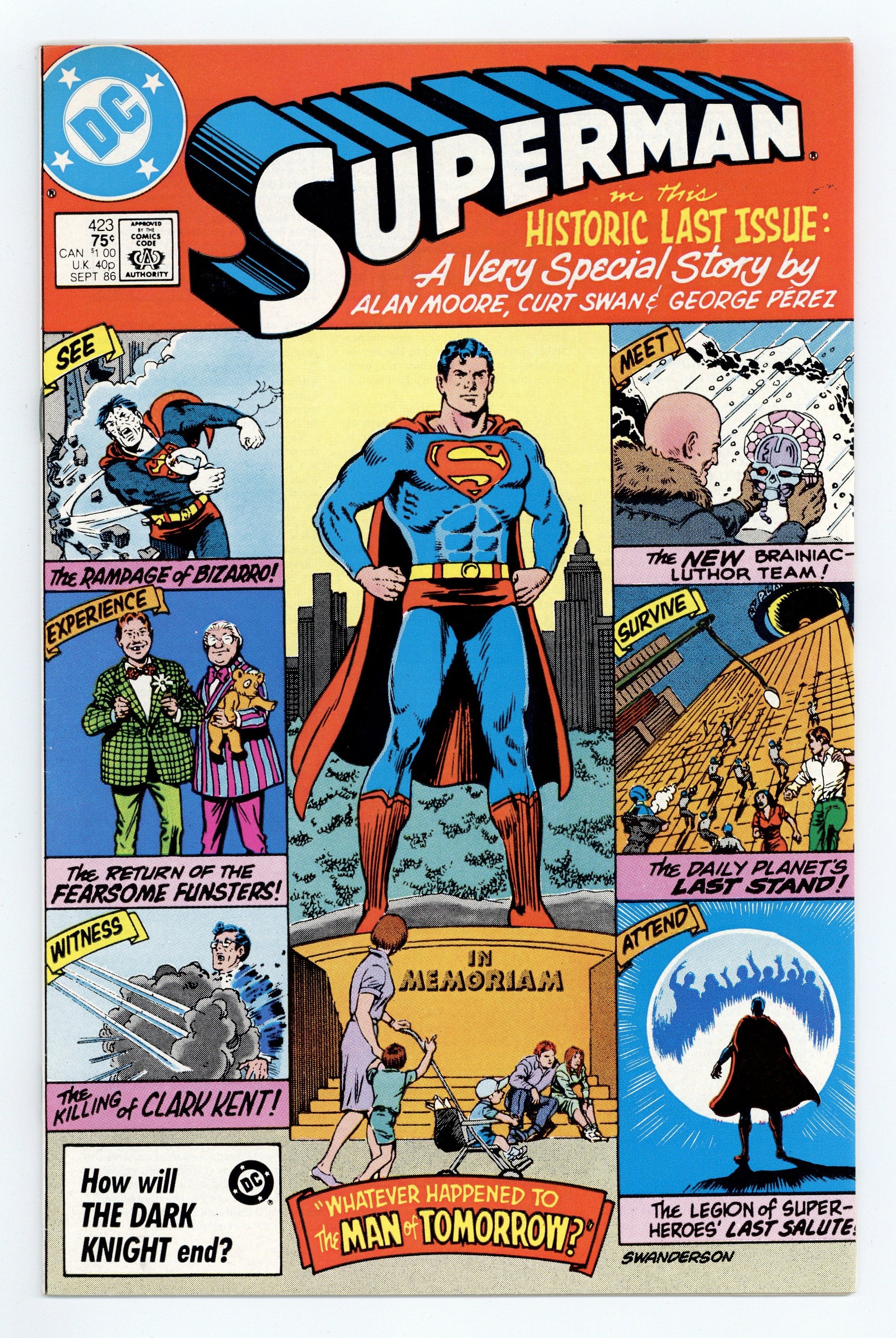 Tags: Whatever Happened to the Man of Tomorrow? (part 1), Superman$19.75Direct Edition. "Whatever Happened to the Man of Tomorrow?" Part 1, continues in Action Comics #583. Art by Curt Swan. Inks by George Pérez. These two issues are the final pre-Crisis Superman issues. Written by Alan Moore. 36 Pages, Full Color. Cover price $0.75.
