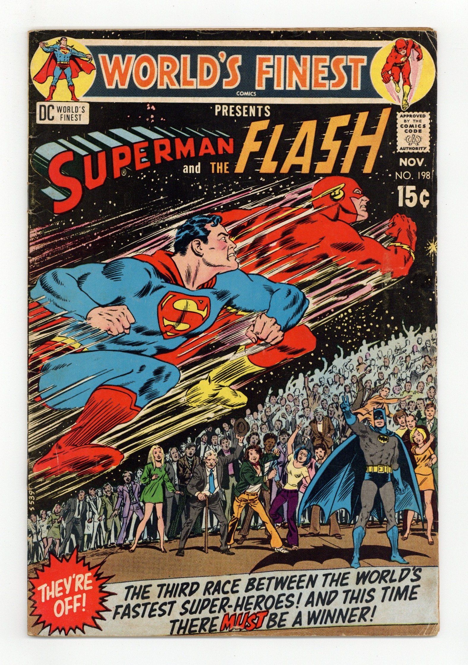 3rd Superman/Flash race. Cover pencils by Curt Swan, inks by Murphy Anderson. Race to Save the Universe! starring Superman and Flash, script by Dennis O'Neil, pencils by Dick Dillin, inks by Joe Giella; Superman and Flash run at twice the speed of light. Joanie Swift, Queen of Speed!--Editors' Round Table: Johnny Quick, art by Paul Norris. 36 Pages, Full Color. Cover price $0.15.
