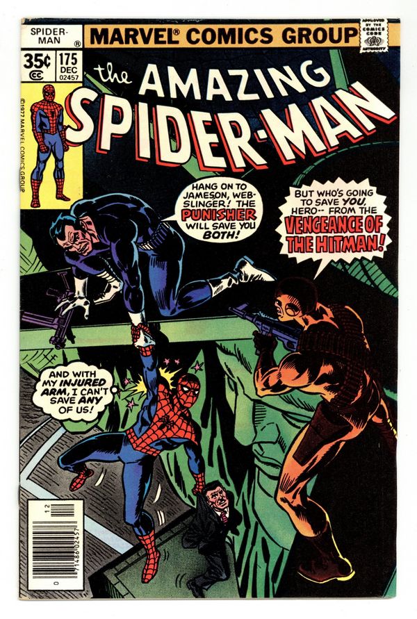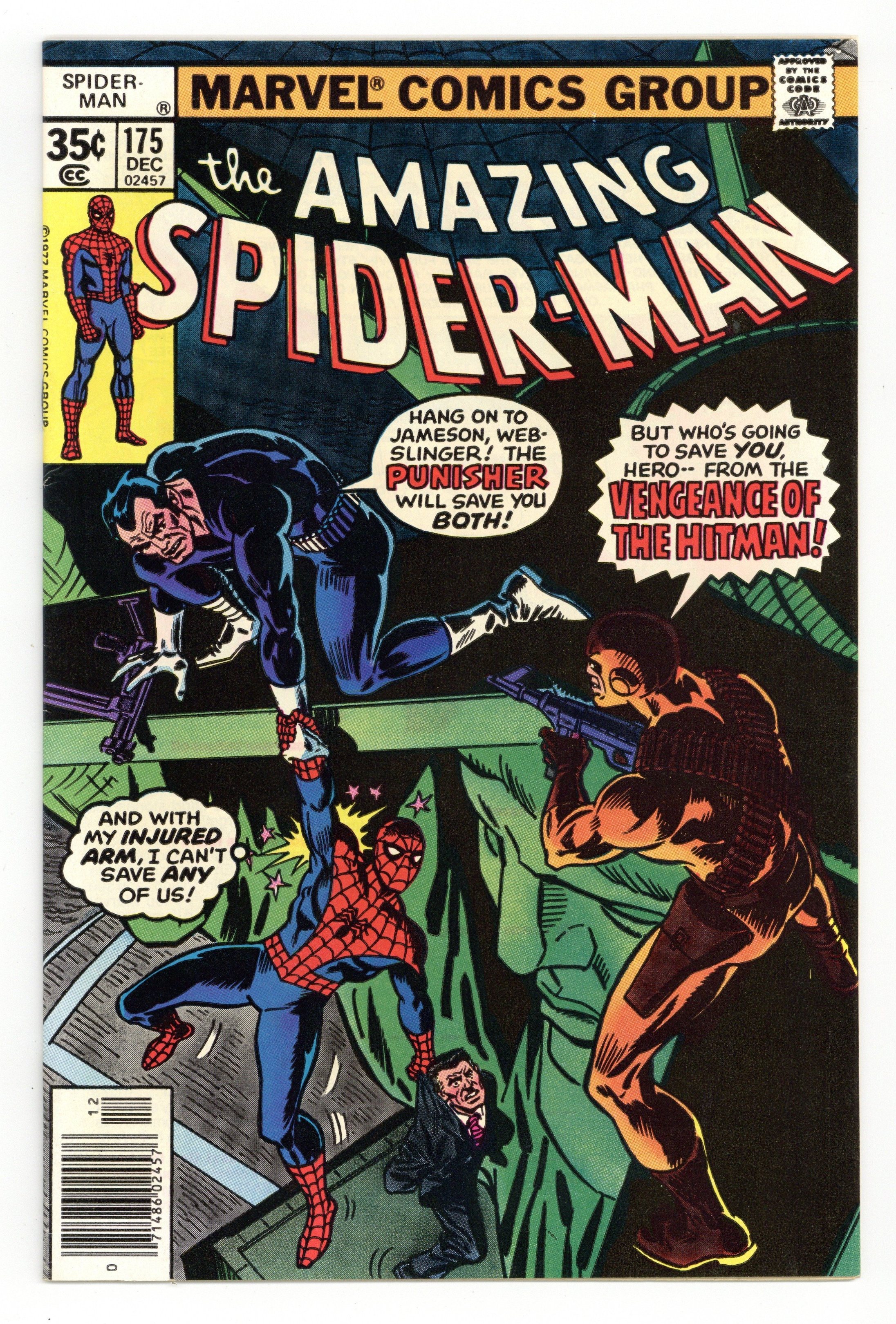Tags: Marvel Legacy Numbering: Amazing Spider-Man (part 175), Spider-Man$16.75"Big Apple Battleground!" Part 2 of 2. Guest-starring the Punisher. Script by Len Wein. Art by Ross Andru (breakdowns) and Jim Mooney (finishes). Cover by Ross Andru and Frank Giacoia. It's a spectacular shootout atop the Statue of Liberty! The inscription at the statue's base calls for the tired, poor, and huddled masses; but tonight, lady liberty is instead receiving the homicidal, vengeful, scared, and amazing! In the persons of the Hitman, Punisher, J. Jonah Jameson, and Spider-Man! Three of the men will survive their harrowing encounter. One will not. An outstanding issue! Final appearance of the Hitman. Cameo appearances by Harry Osborn, Flash Thompson, Joe Robertson, Dr. Marla Madison, and Dr. Bart Hamilton. (Notes: The Punisher appears next in Captain America 241. This story was reprinted in Marvel Tales 217.) 36 pages. Reprinted in Marvel Tales # 217. Cover price $0.35.
