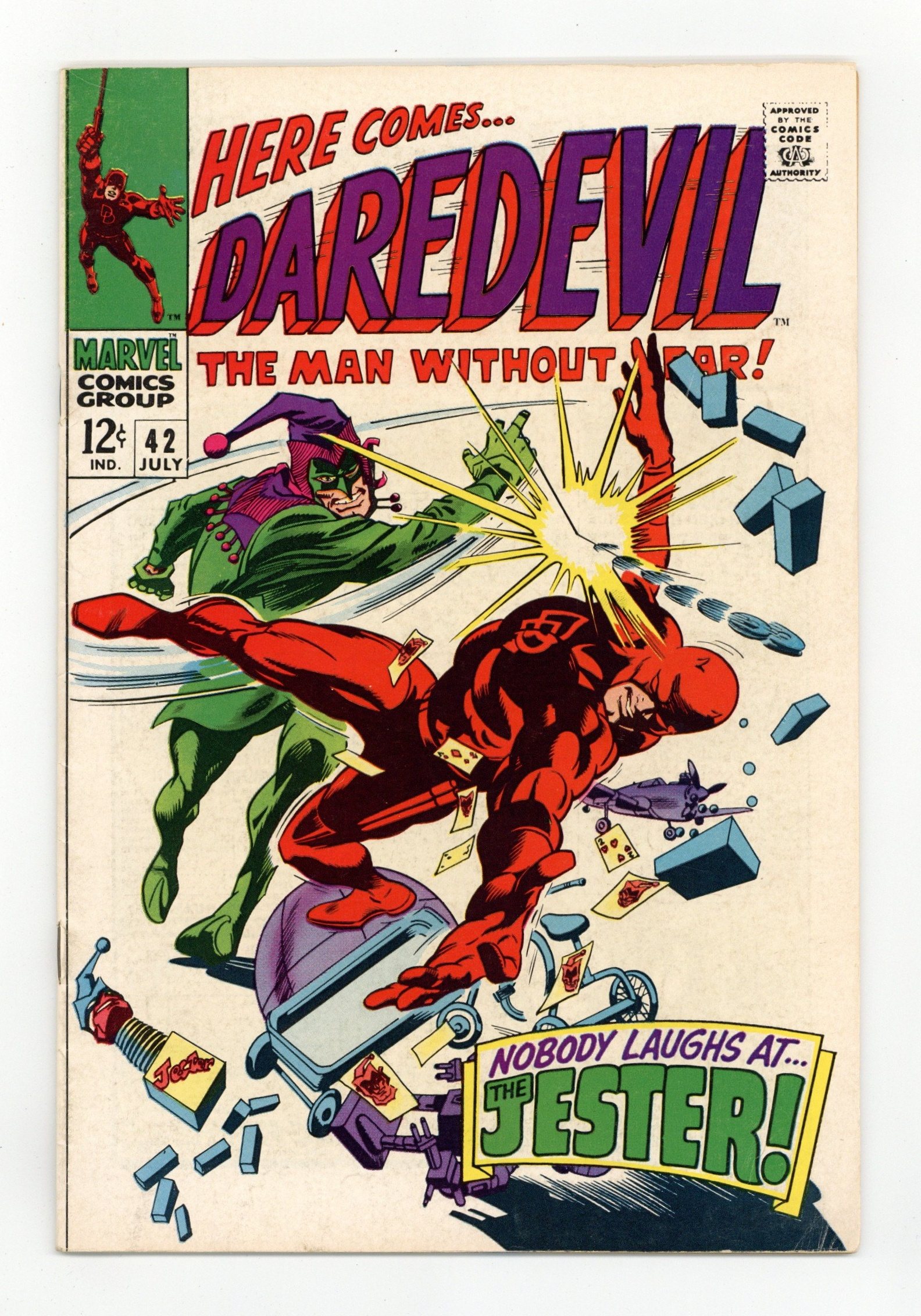 Cover pencils by Gene Colan, inks by Dan Adkins. Nobody Laughs at the Jester, script by Stan Lee, pencils by Gene Colan, inks by Dan Adkins; The Jester bursts onto the scene and is hired by Raleigh to take out the current candidate for D.A. Foggy Nelson; The "new" Daredevil stops the plot and the newest crown prince of crime. Crossover with Spectacular Spider-Man #1.Letter to the editor from comics writer Mark Gruenwald. 36 pgs. Cover price $0.12. Cover price $0.12.