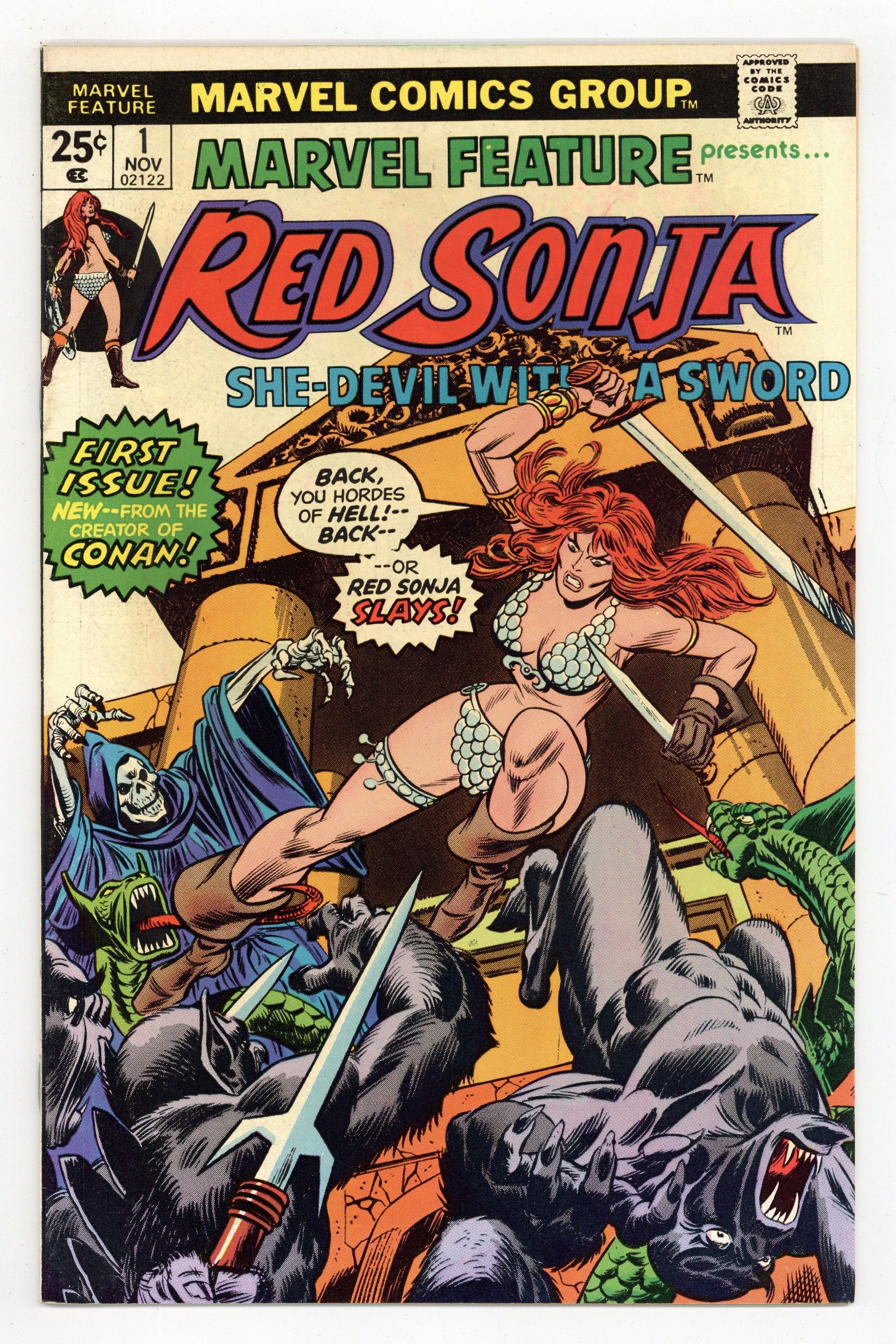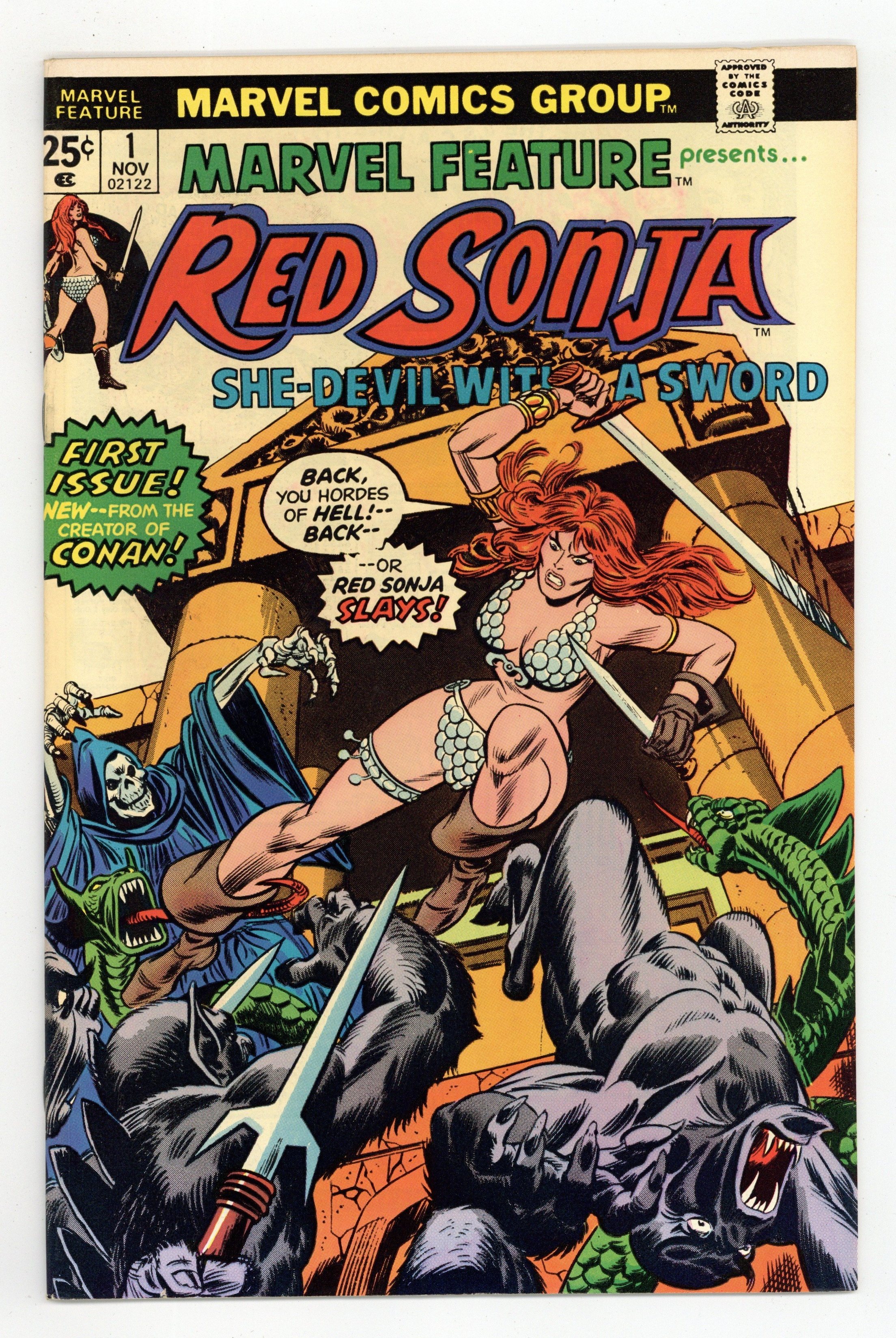 Starts Apr 20 Cover pencils by Gil Kane, inks by John Romita. "The Temple of Abomination!", script by Roy Thomas, pencils by Dick Giordano, inks by Dick Giordano (figures) and Terry Austin (backgrounds); Red Sonja enters a temple and is attacked by a race of Satyrs. Continued from KULL AND THE BARBARIANS #3. "Red Sonja," script by Roy Thomas, pencils by Esteban Maroto, inks by Neal Adams and Ernie Chan; When Red Sonja returns with a tiara she was sent for by King Ghannif she learns her "reward" is to be made a part of his harem; from The Savage Sword of Conan #1. Of Swords and She-Devils article about Red Sonja by Roy Thomas. 36 pgs., full color. $0.25. Cover price $0.25.