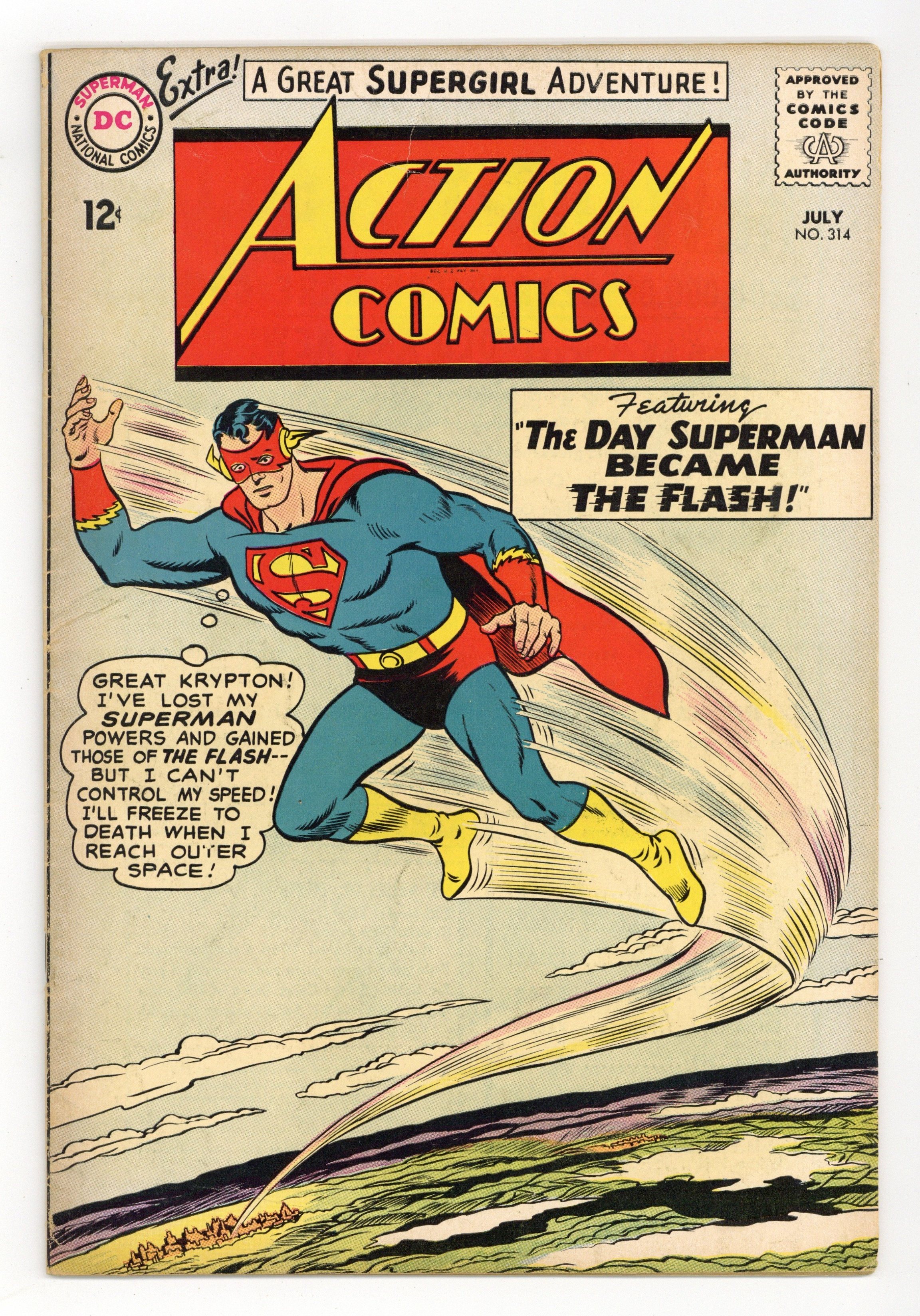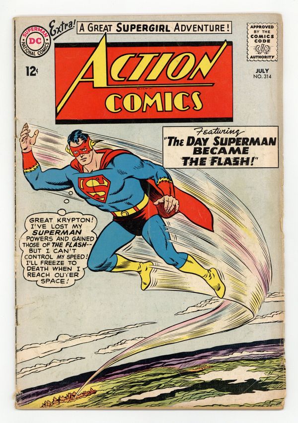 Cover pencils by Curt Swan, inks by Sheldon Moldoff. Justice League of America cross-over in "The Day Superman Became the Flash!", script by Edmond Hamilton, art by Al Plastino; Aquaman discovers and delivers to Supermen a video recording of Jor-El that tells about several computer predictions he once commissioned to help him choose where to send his son's rocket after the destruction of Krypton; Superman watches it with his Justice League friends. One-page Casey the Cop story by Henry Boltinoff. "Supergirl's Tragic Ordeal!", script by Leo Dorfman, art by Jim Mooney; Now living in Kandor, Supergirl's mother Allura suffers a health crisis because she misses Kara so deeply; Supergirl's adopted parents Fred and Edna Danvers agree to trade places with Zor-El and Allura. 9th Giant Superman Annual ad. Batman Family ad. Superman model kit ad on back cover with art by Swan. 36 Pages, Full Color. $0.12 Cover price $0.12.