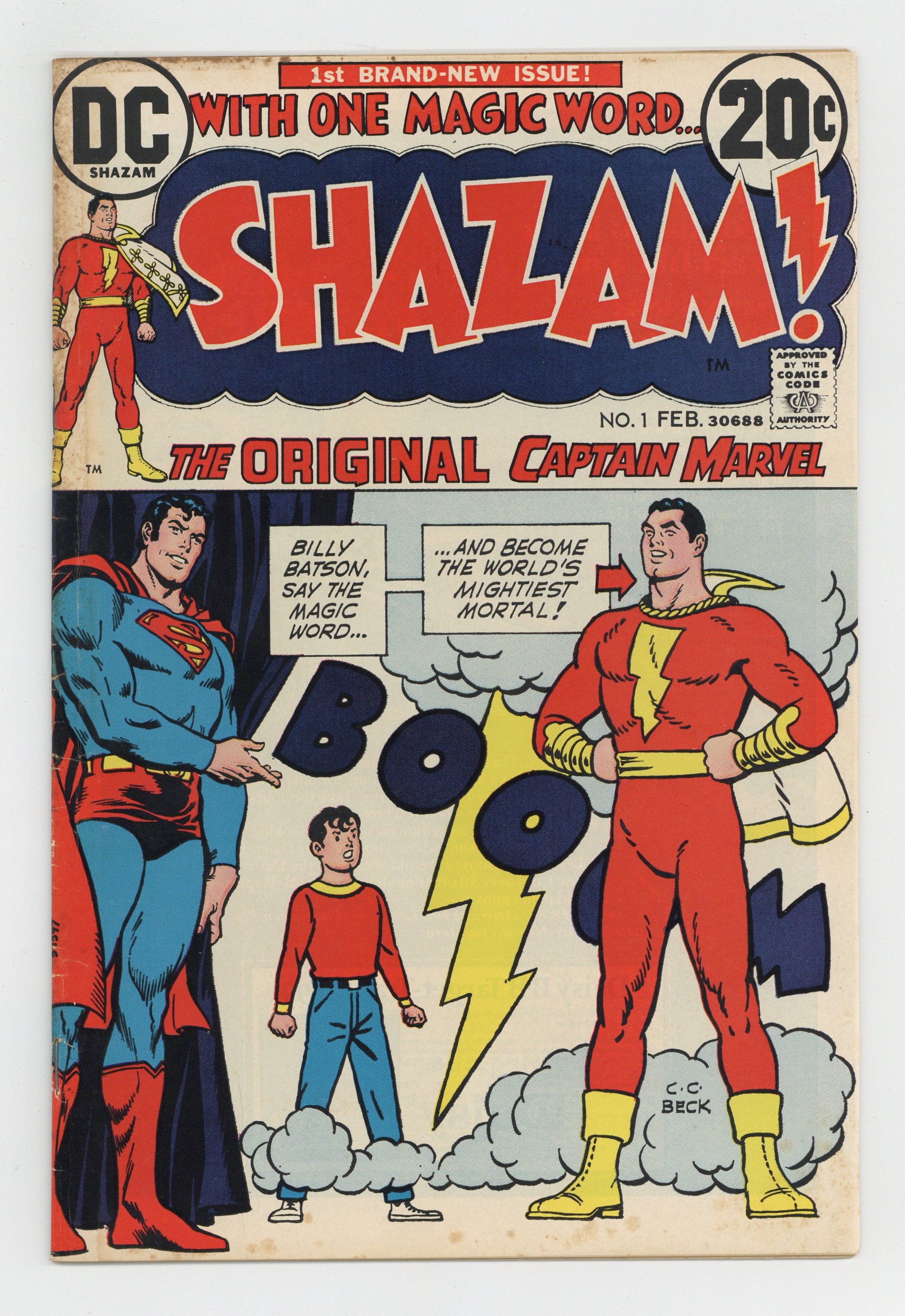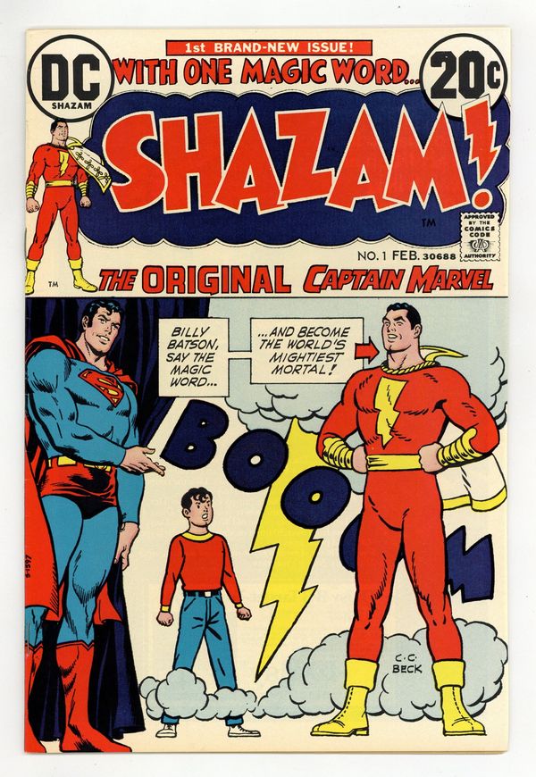 Tags: Superman$32.50Cover by C. C. Beck, Nick Cardy, and Murphy Anderson. ...In the Beginning ..., script by Denny O'Neil, art by C. C. Beck; After missing for 20 years, Captain Marvel returns to Earth; Origin retold. The World's Wickedest Plan, script by Denny O'Neil, art by C. C. Beck; Captain Marvel escapes the trap that Dr. Sivana had created that caused the Marvel Family to be placed in suspended animation for the last 20 years. Reprint back-up: "The Endless String" (from Captain Marvel Adventures 55 in 1946), written by Otto Binder, art by Pete Costanza. One-page text feature by E. Nelson Bridwell--a history of Captain Marvel. 36 pgs., full color. $0.20. Cover price $0.20.