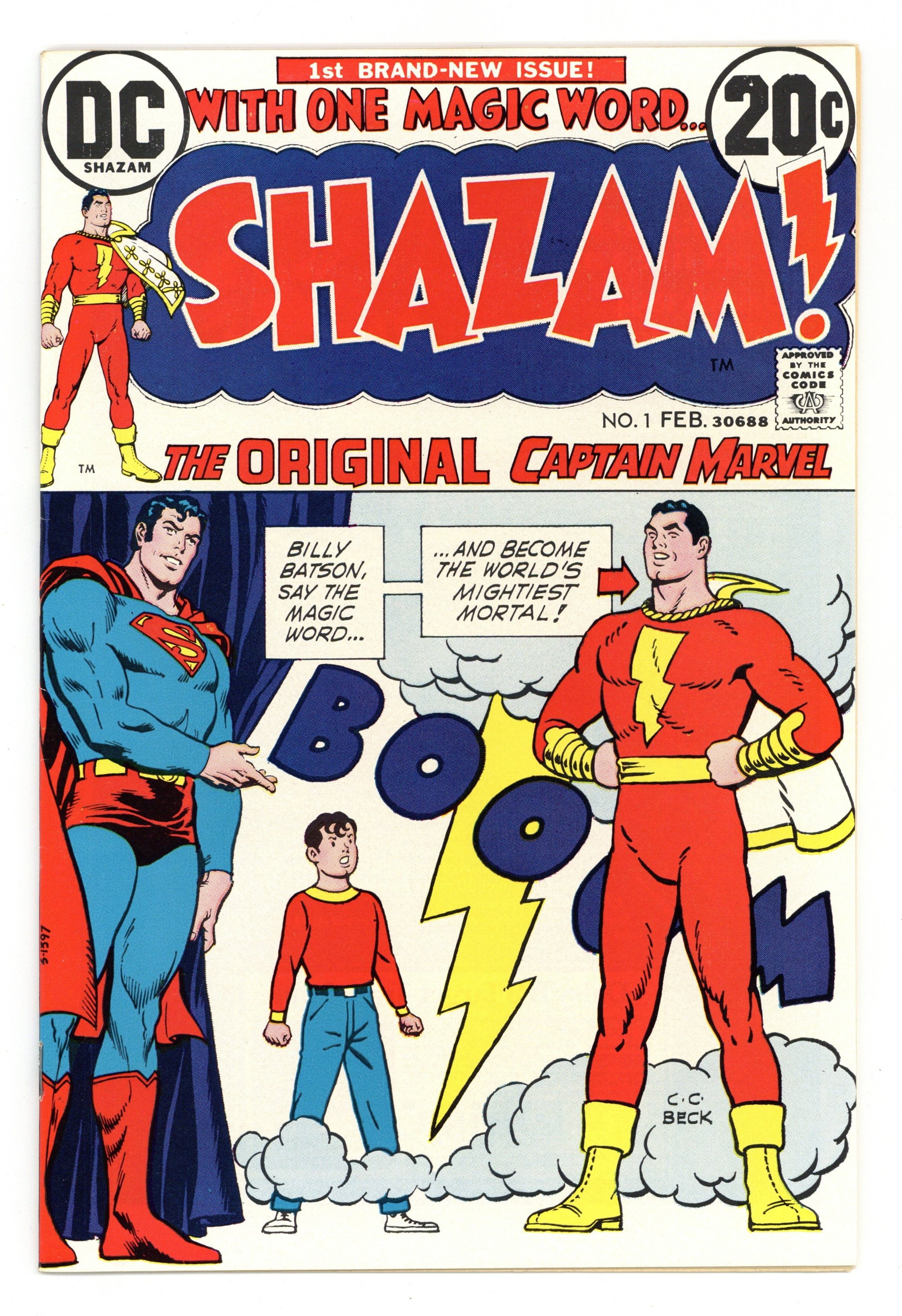 Tags: Superman$25.00Cover by C. C. Beck, Nick Cardy, and Murphy Anderson. ...In the Beginning ..., script by Denny O'Neil, art by C. C. Beck; After missing for 20 years, Captain Marvel returns to Earth; Origin retold. The World's Wickedest Plan, script by Denny O'Neil, art by C. C. Beck; Captain Marvel escapes the trap that Dr. Sivana had created that caused the Marvel Family to be placed in suspended animation for the last 20 years. Reprint back-up: "The Endless String" (from Captain Marvel Adventures 55 in 1946), written by Otto Binder, art by Pete Costanza. One-page text feature by E. Nelson Bridwell--a history of Captain Marvel. 36 pgs., full color. $0.20. Cover price $0.20.
