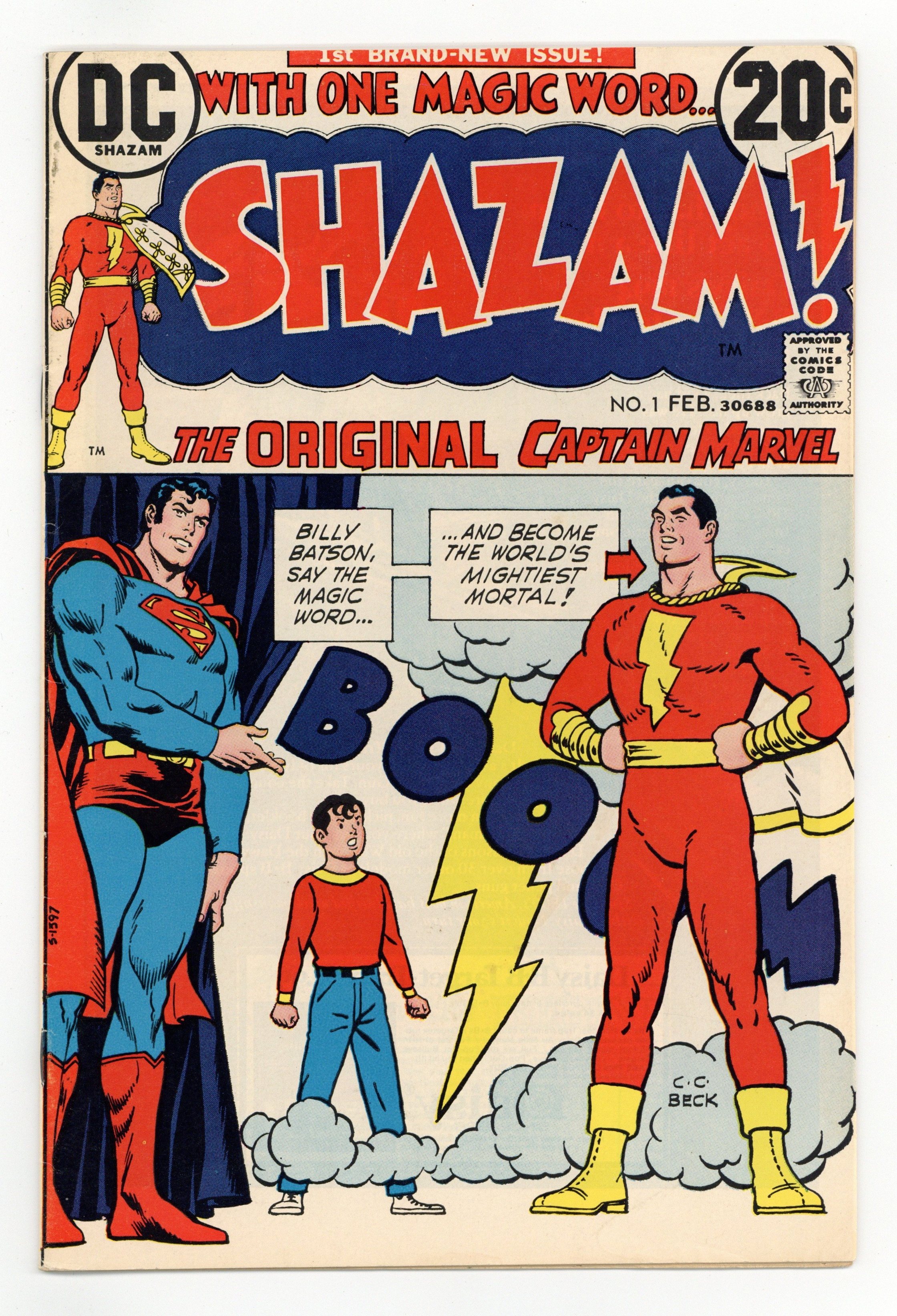 Starts Feb 9 Cover by C. C. Beck, Nick Cardy, and Murphy Anderson. ...In the Beginning ..., script by Denny O'Neil, art by C. C. Beck; After missing for 20 years, Captain Marvel returns to Earth; Origin retold. The World's Wickedest Plan, script by Denny O'Neil, art by C. C. Beck; Captain Marvel escapes the trap that Dr. Sivana had created that caused the Marvel Family to be placed in suspended animation for the last 20 years. Reprint back-up: "The Endless String" (from Captain Marvel Adventures 55 in 1946), written by Otto Binder, art by Pete Costanza. One-page text feature by E. Nelson Bridwell--a history of Captain Marvel. 36 pgs., full color. $0.20. Cover price $0.20.