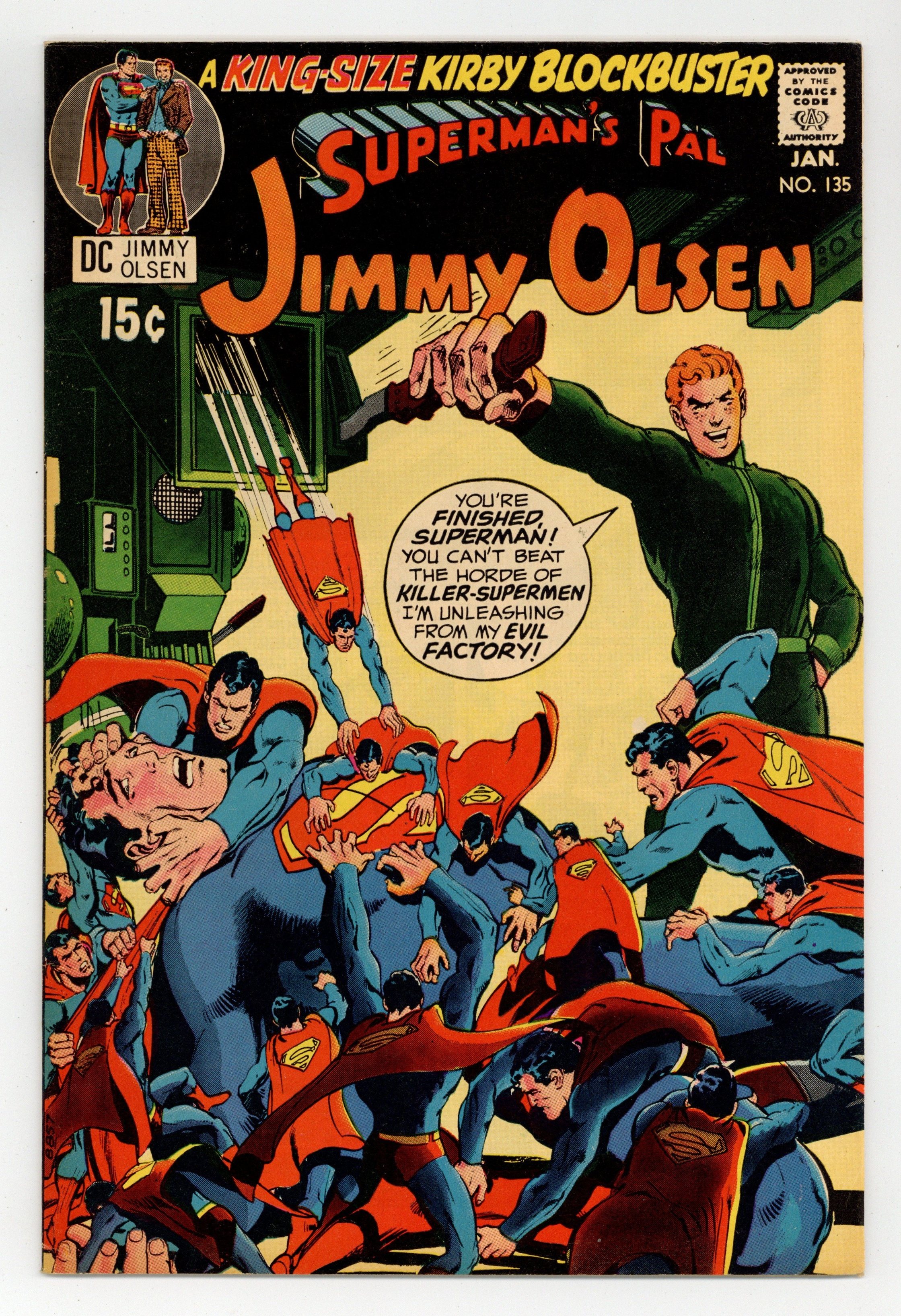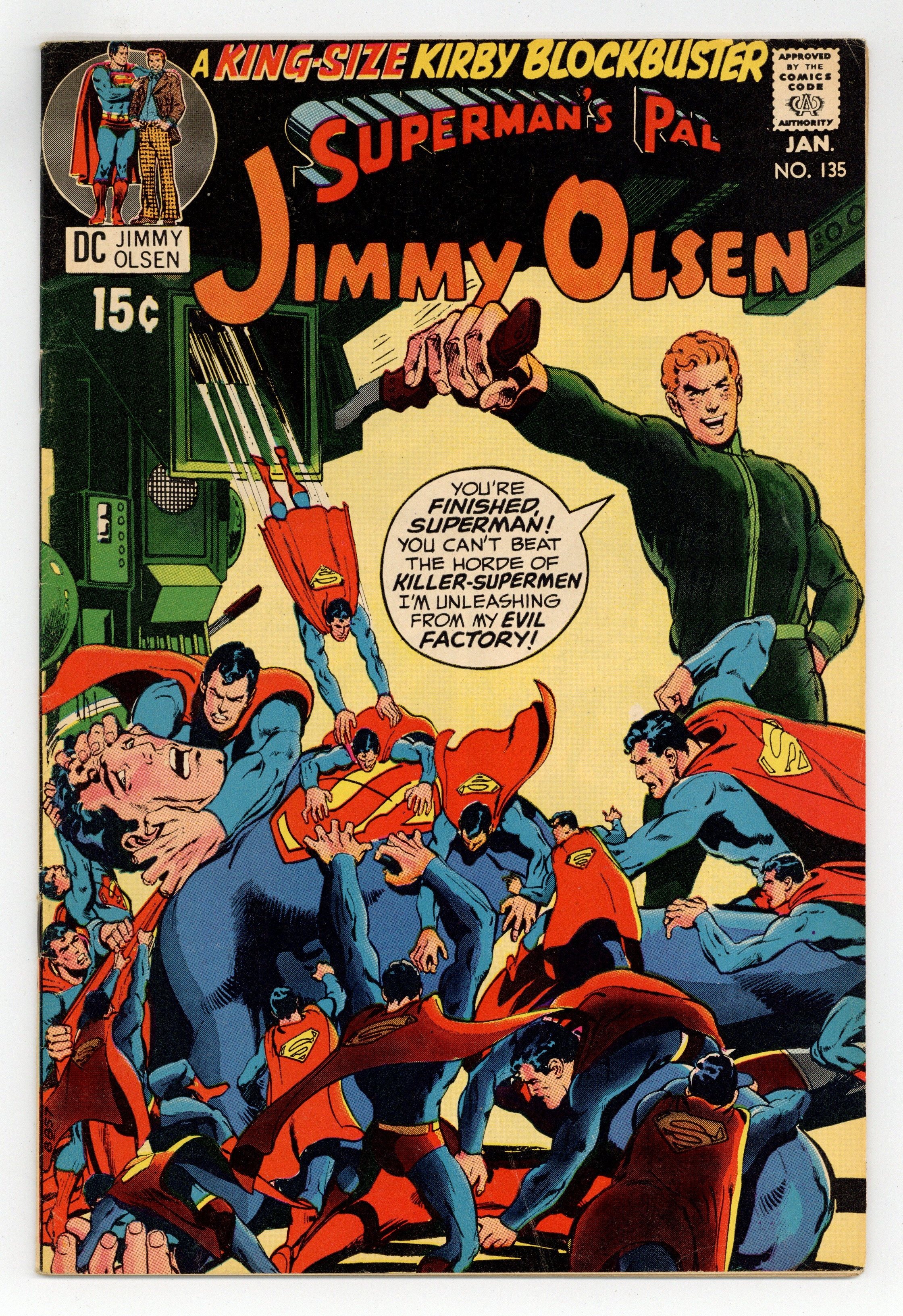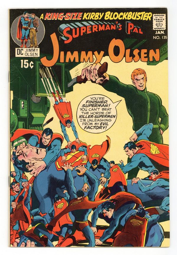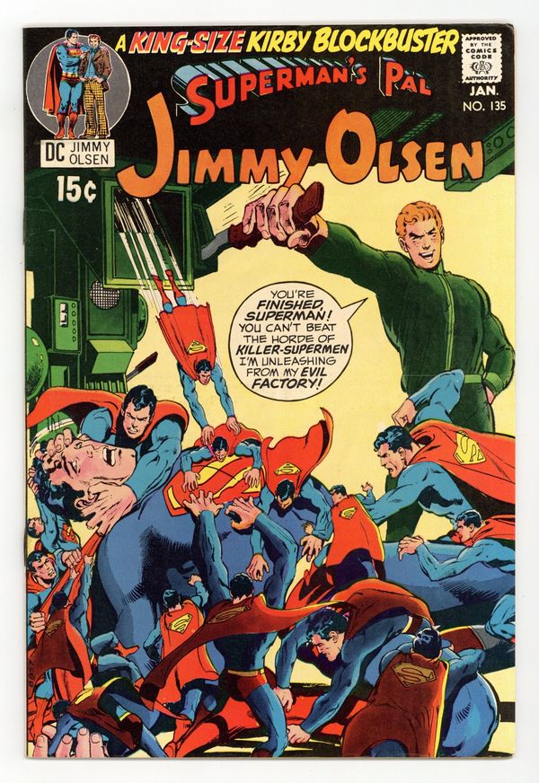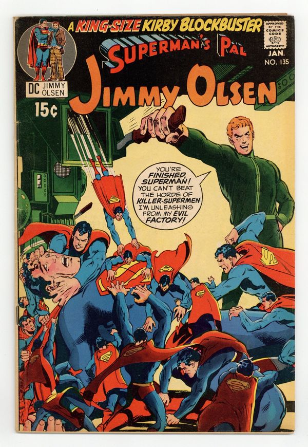 2nd appearance of Darkseid (cameo). Cover art by Neal Adams. Evil Factory!, script by Jack Kirby, pencils by Jack Kirby and Al Plastino (Superman heads), inks by Vince Colletta; Superman leads Jimmy and the Newsboy Legion to The Project where the original Newsboy Legion work as scientists to crack the DNA code and create clones; Meanwhile, minions of Darkseid, Mokkari and Simyan, dispatch their own clone of Jimmy to The Project complex. The Hairies -- Super-Race -- Or Man's Second Chance article. Snoopy with Sopwith Camel plane--model ad from Monogram. 36 Pages, Full Color. Cover price $0.15.