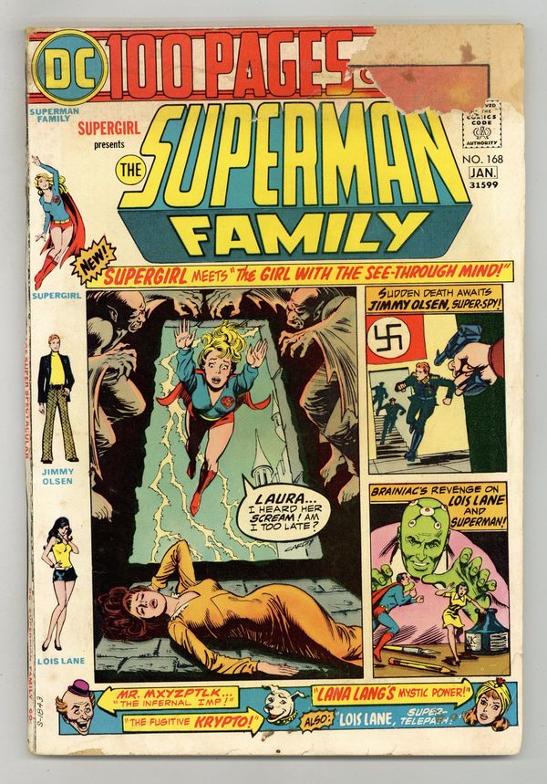 100-page giant. New Supergirl story, "The Girl With the See-Through Mind" (script by Elliot Maggin, pencils by John Rosenberger, inks by Vince Colletta). Reprints: Jimmy Olsen in "Jimmy's D-Day Adventure" (script by Leo Dorfman, pencils by Curt Swan, inks by George Klein), Lois Lane in "Lois Lane, Super-Telepath" (script by Otto Binder, art by Kurt Schaffenberger), Krypto in "The Fugitive Krypto" (art by George Papp), Mr. Mxyzptlk in "The Infernal Imp" (art by Swan/Klein), Lana Lang in "Lana Lang's Mystic Power" (art by Papp), and Brainiac in "Brainiac's Super-Revenge" (art by Swan/Klein). Also in this issue: two-page "E.S.Peek at Lena Thorul," crossword puzzle by Bob Rozakis, and "Comedy Cover Capers." Nick Cardy cover. Cover price $0.60.