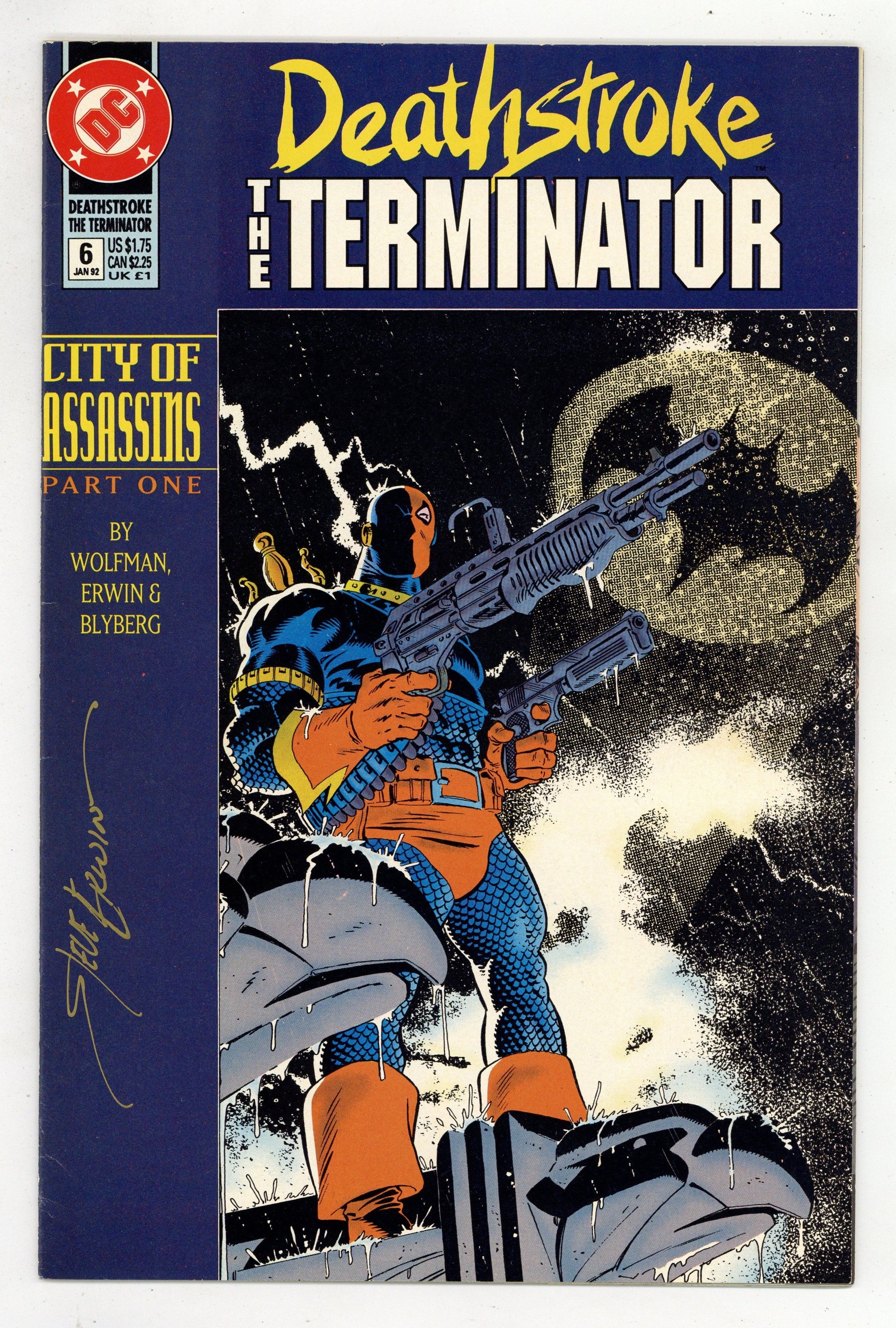 City of Assassins: Part 1 of 4. "Revelations and Revolutions!" Batman cameo. Story by Marv Wolfman. Art by Steve Erwin and Will Blyberg. Cover by Mike Zeck. Someone is assassinating mob bosses in Gotham City. Deathstroke intends to find out who. The only problem is Gotham is the home of the Dark Knight, and he doesn't take kindly to a wanted murderer running around his city. Cover price $1.75.