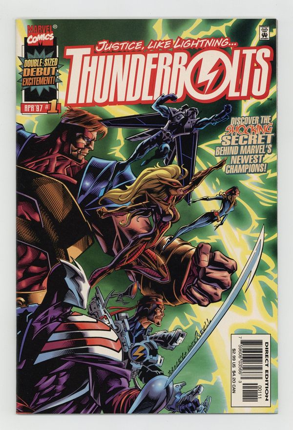 First Printing. Direct Edition. 1st appearance Hallie Takahama (becomes Jolt). Pencils by Mark Bagley, inks by Vince Russell. Justice ... Like Lightning!, script by Kurt Busiek, pencils by Mark Bagley, inks by Vince Russell; Earth's newest heroic team, the Thunderbolts, bursts on the scene to widespread acclaim ... but all is not as it seems. 52 pgs.