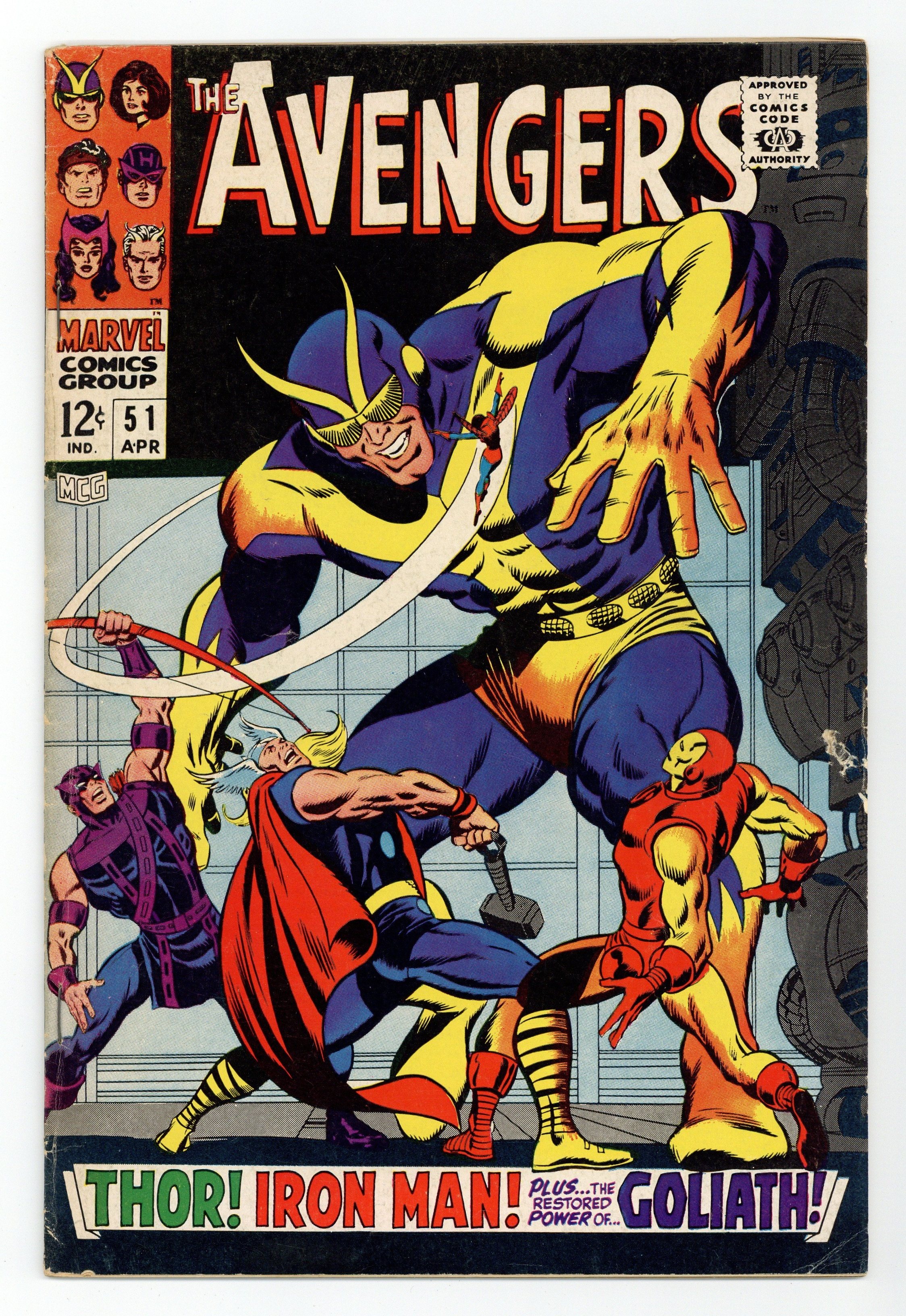 Tags: Marvel Legacy Numbering: Avengers (part 51), Avengers$25.50"In the Clutches of the Collector!" Script by Roy Thomas. Pencils by John Buscema. Inks by George Tuska. Cover by John Buscema and Joe Sinnott.With the Avengers' roster down to three, Hank Pym tries desperately to restore his size-changing powers! But his first attempt fails! And before he can try again; the Collector abducts Hank and his two remaining teammates! The trio of avengers is shocked to be onboard the Collector's ship! And further shocked that the thunder god is working with the ancient elder of the universe! With four avengers (including Thor) already in his collection, the Collector sends the Prince of Asgard to add a fifth: the Invincible Iron Man! A weakened Shell-Head valiantly battles Thor, but tono avail! How can the Avengers turn the tables on the Collector? Maybe the Wasp has an idea! Cameo appearances by the Hulk, Captain America, and the Black Panther. Avengers Lineup: Goliath, Hawkeye, Iron Man, Thor, and the Wasp. (Notes: The Collector appears next in Iron Man #26 and will attempt to collect Earth's Mightiest Heroes again in Avengers 119. The letters page includes letters from comics writers Doug Moench and Tony Isabella, respectively. This issue was reprinted in Marvel Triple Action #43.) 36 pages. Cover price $0.12.