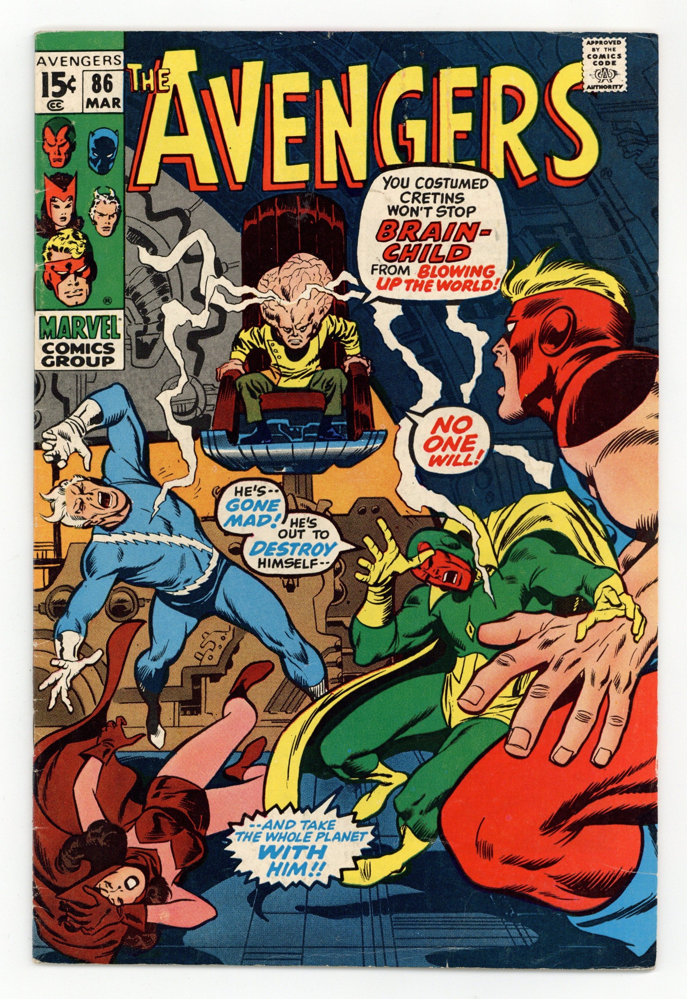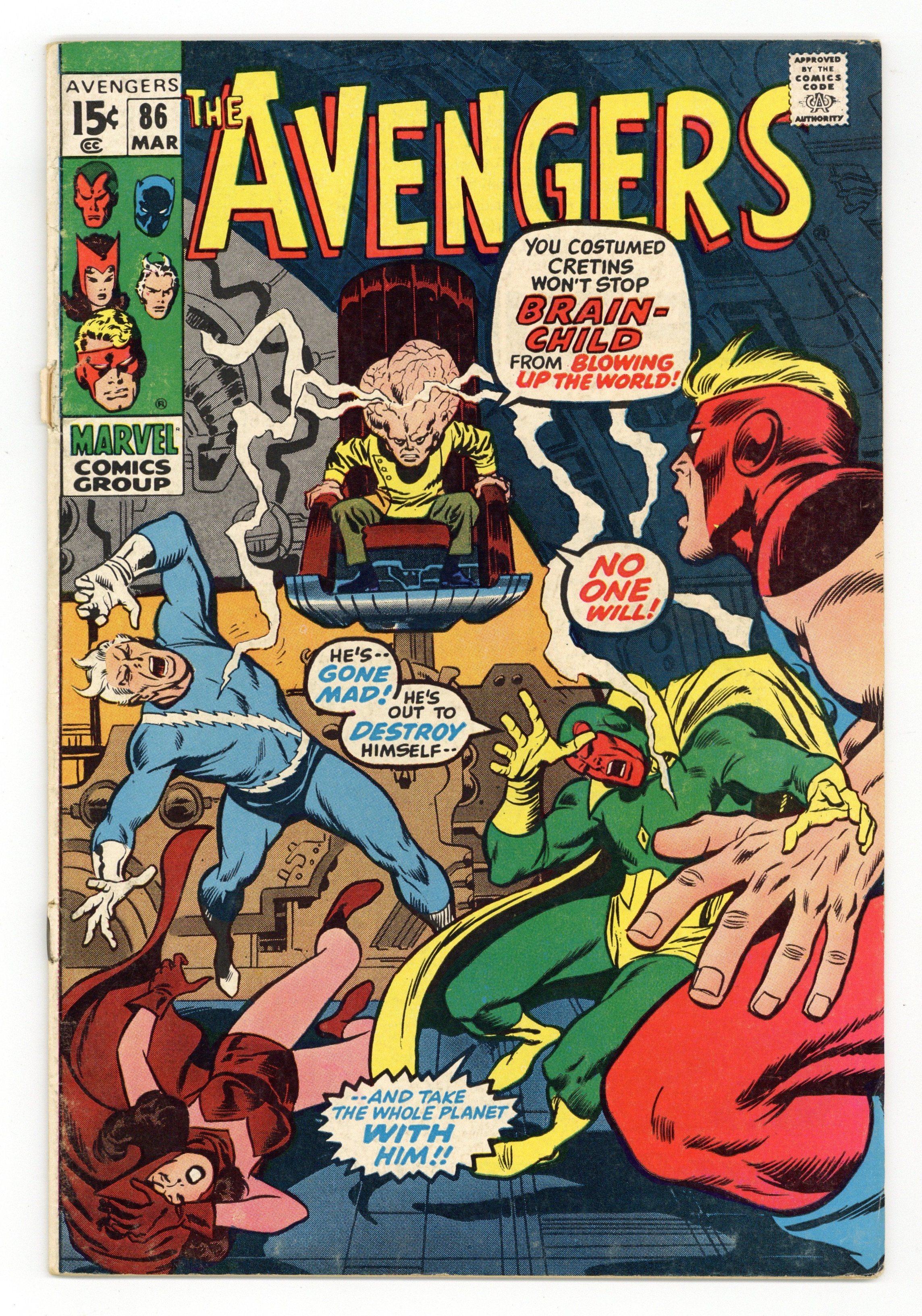 "Brain-Child to the Dark Tower Came" Part 2 of 2. Script by Roy Thomas. Pencils by Sal Buscema. Inks by Jim Mooney. Cover by John Buscema and Jim Mooney. The Avengers and Nighthawk race to Atomic City (of Earth-712) to halt the launch of Brain-Child's doomsday rocket! However three members of the Squadron Supreme are currently guarding the launch site to ensure a safe liftoff! Fortunately after Wanda stops the launch, Nighthawk is able to explain to his teammates the dire situation! And Hyperion, Doctor Spectrum, and the Whizzer agree to join the assault on Brain-Child's tower fortress! Can the eight heroes (from two different Earths) bring the child prodigy's delusional dreams to an end? Goliath will lead the charge! Avengers Lineup: Black Panther, Goliath, Iron Man, Scarlet Witch, Quicksilver, Thor, and the Vision. (Notes: Earth's Mightiest Heroes and the Squadron Supreme meet again in Avengers 141, but as adversaries instead of allies. Len Wein contributed to the plot of this two-part story. Theletters page includes a letter from comics writer Mike W. Barr. This issue contains a statement of ownership: average print run 385,239; average paid circulation 217,394.) 36 pages. Cover price $0.15.