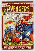 $30.50"This Beachhead Earth" Part 5 of 9. Double-sized issue. Guest-starring Captain Marvel. Script by Roy Thomas. Pencils by Neal Adams. Inks by Tom Palmer. Cover by Neal Adams and Tom Palmer. One of the iconic issues of the Avengers! The acclaimed Kree/Skrull War kicks into high gear with the brilliant pencils of Neal Adams! After leaving Avengers Mansion in shame; Quicksilver, Goliath, Rick Jones, the Scarlet Witch, and the Vision trek to upstate New York to check on the safety of Captain Marvel. But before they can reach the safe house, the Fantastic Four (or some alien race mimicking their powers) attacks! In the chaotic battle that follows, Wanda and Pietro are captured and the Vision is badly injured! With his synthetic body failing, the Vision limps back to the mansion! And once inside (and as famously illustrated), the astonishing Ant-Man takes a perilous journey to the center of the android! Can Hank Pym revive the synthezoid avenger? And get Earth's Mightiest Heroes back into the intergalactic free-for-all? Appearances by Rick Jones and the Super-Skrull. Avengers Lineup: Ant-Man, Captain America, Goliath, Iron Man, Quicksilver, Scarlet Witch, Thor, and the Vision. Cover price 25¢. (Notes: The Vision becomes a mainstay next to the Avengers cover logo thru issue 184. Possible cover alterations made by Marie Severin. The second half of the Kree/Skrull War (issues 93-97) was reprinted in 1983 in the two-issue special edition: The Kree-Skrull War starring the Avengers.) 52 pages. Cover price $0.25.