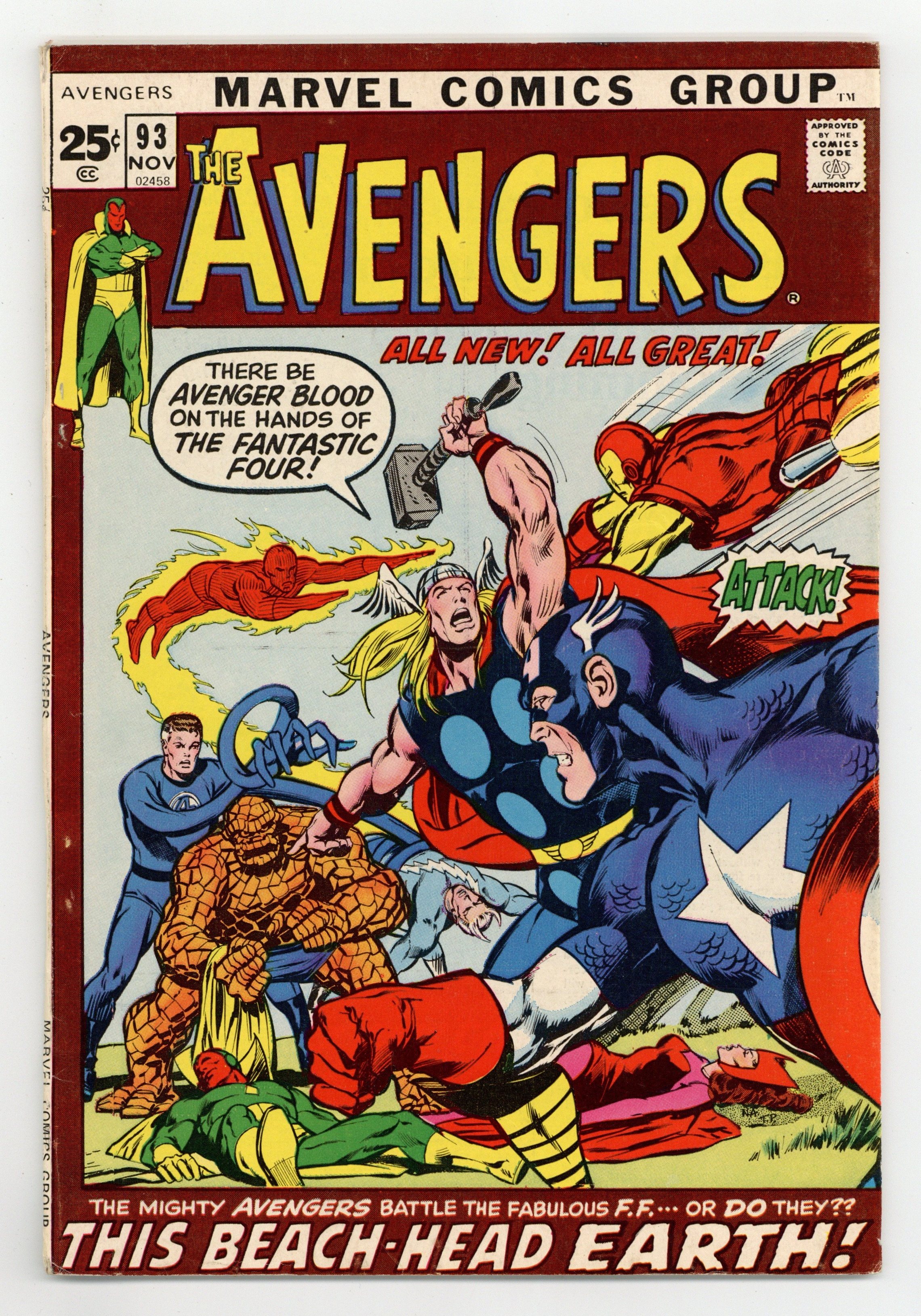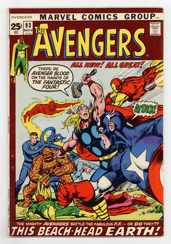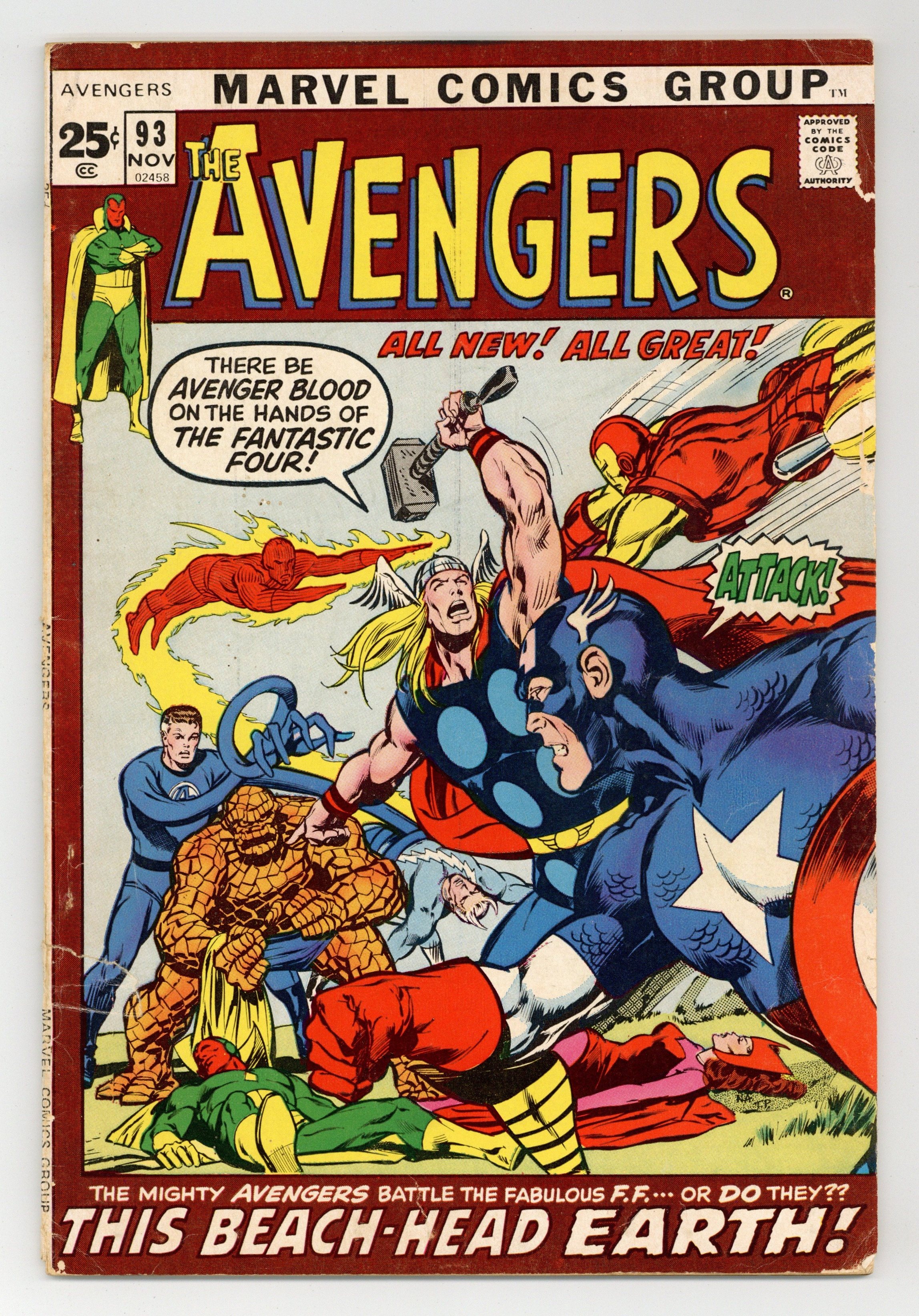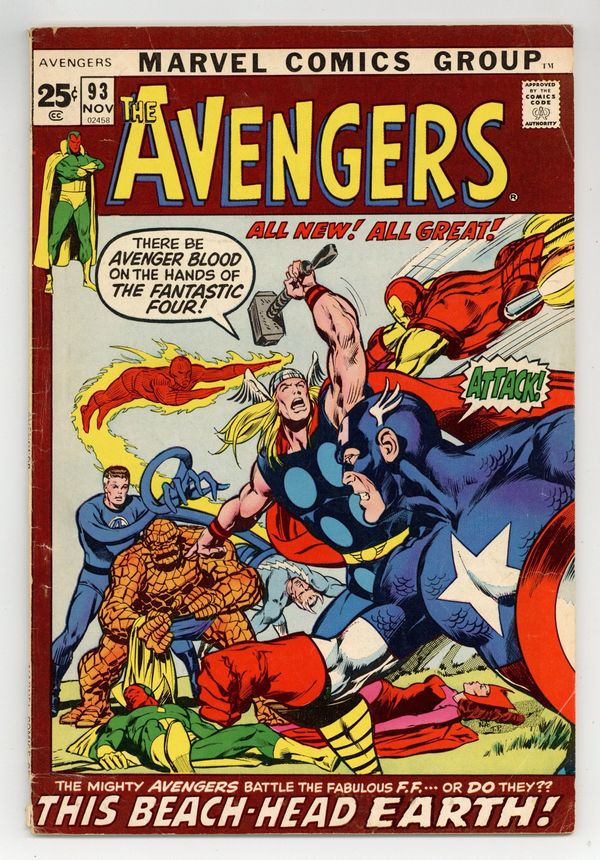 "This Beachhead Earth" Part 5 of 9. Double-sized issue. Guest-starring Captain Marvel. Script by Roy Thomas. Pencils by Neal Adams. Inks by Tom Palmer. Cover by Neal Adams and Tom Palmer. One of the iconic issues of the Avengers! The acclaimed Kree/Skrull War kicks into high gear with the brilliant pencils of Neal Adams! After leaving Avengers Mansion in shame; Quicksilver, Goliath, Rick Jones, the Scarlet Witch, and the Vision trek to upstate New York to check on the safety of Captain Marvel. But before they can reach the safe house, the Fantastic Four (or some alien race mimicking their powers) attacks! In the chaotic battle that follows, Wanda and Pietro are captured and the Vision is badly injured! With his synthetic body failing, the Vision limps back to the mansion! And once inside (and as famously illustrated), the astonishing Ant-Man takes a perilous journey to the center of the android! Can Hank Pym revive the synthezoid avenger? And get Earth's Mightiest Heroes back into the intergalactic free-for-all? Appearances by Rick Jones and the Super-Skrull. Avengers Lineup: Ant-Man, Captain America, Goliath, Iron Man, Quicksilver, Scarlet Witch, Thor, and the Vision. Cover price 25¢. (Notes: The Vision becomes a mainstay next to the Avengers cover logo thru issue 184. Possible cover alterations made by Marie Severin. The second half of the Kree/Skrull War (issues 93-97) was reprinted in 1983 in the two-issue special edition: The Kree-Skrull War starring the Avengers.) 52 pages. Cover price $0.25.