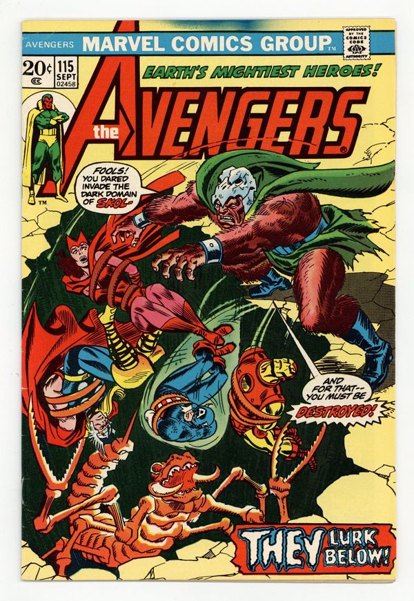 "Below Us The Battle!" Avengers-Defenders crossover. Script by Steve Englehart. Pencils by Bob Brown. Inks by Mike Esposito. Cover by John Romita and Mike Esposito. The Avengers fly to Great Britain to visit their fellow avenger, the Black Knight! But when the team approaches Garrett Castle, an invisible barrier repulses them! While Earth's Mightiest Heroes are devising a way to pierce the mystical barrier, a group of troglodytes attack! Where did these grotesque creatures come from? Surprisingly, the cave-dwellers get the best of the Avengers and throw them into a deep underground pit! Surrounded by complete darkness and with the troglodytes moving in for the kill, Earth's Mightiest Heroes turn to the Black Panther to save the day! Can T'Challa single-handedly lead the charge to victory? Flashback cameos by Magneto and Doctor Strange. Second story: "Alliance Most Foul!" Avengers-Defenders Clash Part 1 of 8. At the conclusion of Thor 207, a blind Loki fell off a high cliff and seemed headed toward certain death below! But unbeknownst to anyone, the god of lies and mischief was rescued by none other than the Dread Dormammu! Why would Dormammu do that and for what sinister purpose? If Loki and Dormammu were to join forces, who on Earth could stop them? Story continues in the second story of Defenders 8. Avengers Lineup: Black Panther, Captain America, Mantis, Iron Man, Scarlet Witch, Swordsman, Thor, and the Vision. (Notes: The Black Knight most recently fought alongside Earth's Mightiest Heroes in Avengers 100. Dormammu previously appeared in Marvel Feature (1st series) 2. The letters page includes letters from comics artists Richard Howell and Dusty Vohland respectively.) 36 pages Cover price $0.20.