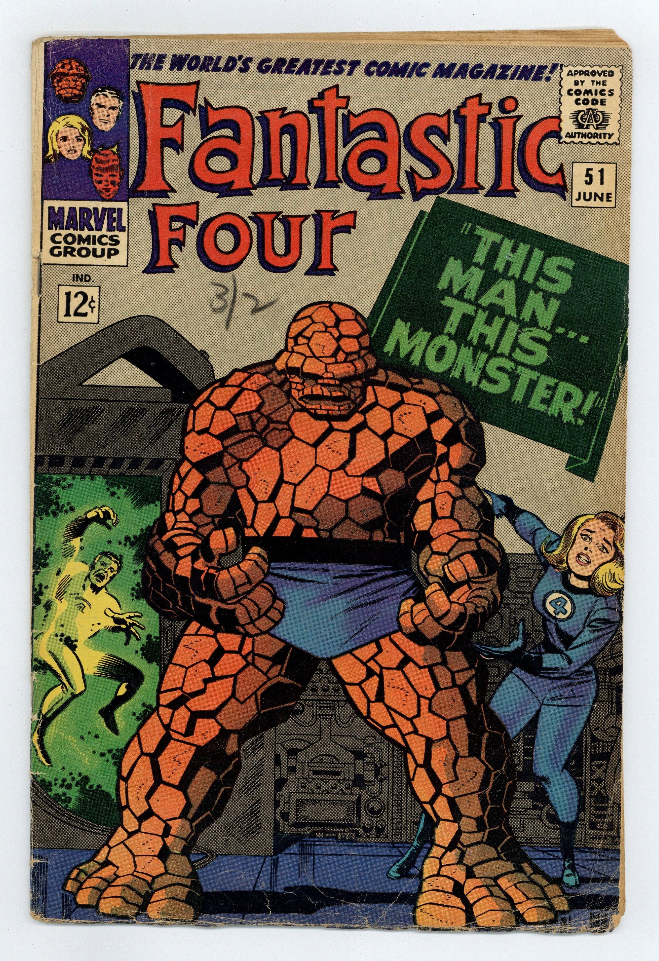 1st Printing. Cover pencils by Jack Kirby, inks by Joe Sinnott. This Man... This Monster!, script by Stan Lee, pencils by Jack Kirby, inks by Joe Sinnott; An unnamed scientist gives himself the powers and appearance of the Thing and goes to the Baxter Building, planning to kill Reed; However, an accident results in him saving Reed's life and perishing in the Negative Zone. 36 pgs. $0.12. NOTE: JC Penney 1993 reprint exists. It can be identified by the back cover: X-Men on Video ad. Cover price $0.12.