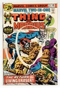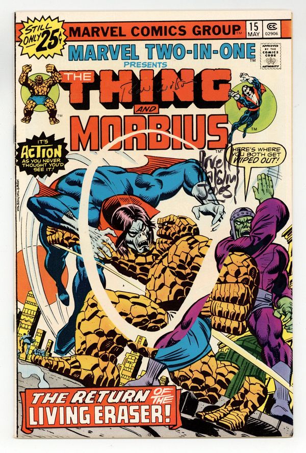 Morbius, the Living Vampire guest stars in "The Return of the Living Eraser!" Script by Bill Mantlo, pencils by Arv Jones, inks by Dick Giordano. Seeking sustenance, Morbius attacks Alicia Masters. Big mistake, for Alicia just so happens to be the girlfriend of one Benjamin J. Grimm, a.k.a. the Thing. And when he catches the macabre creature hassling his squeeze, well... "It's Clobberin' Time!" Plus, witness the return of the alien villain called the Living Eraser (last seen in Tales to Astonish # 49). Letters to the editor from comics writer Ralph Macchio and writer Paul Dini (animated Batman; Lost). The letters page also includes Marvel Value Stamp series B # 79, upper right corner of the Silver Surfer by Jack Kirby. Spider-Man stars in a oneppage Hostess ad, "The Twinkie Takers." Ron Wilson cover pencils, Al Milgrom cover inks. Cover price $0.25.
