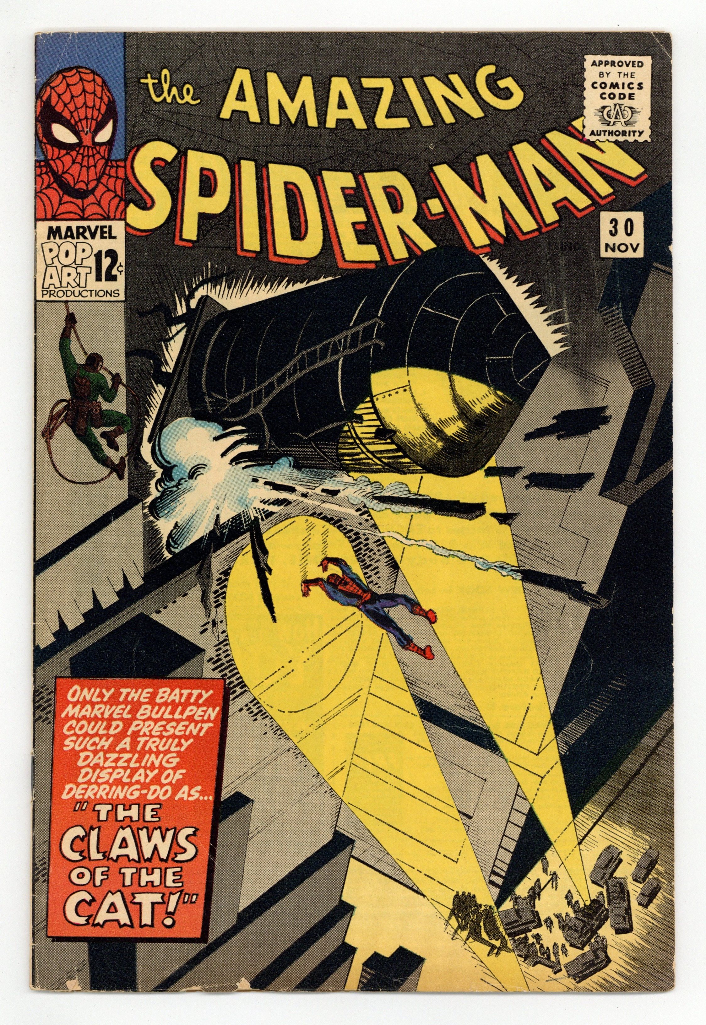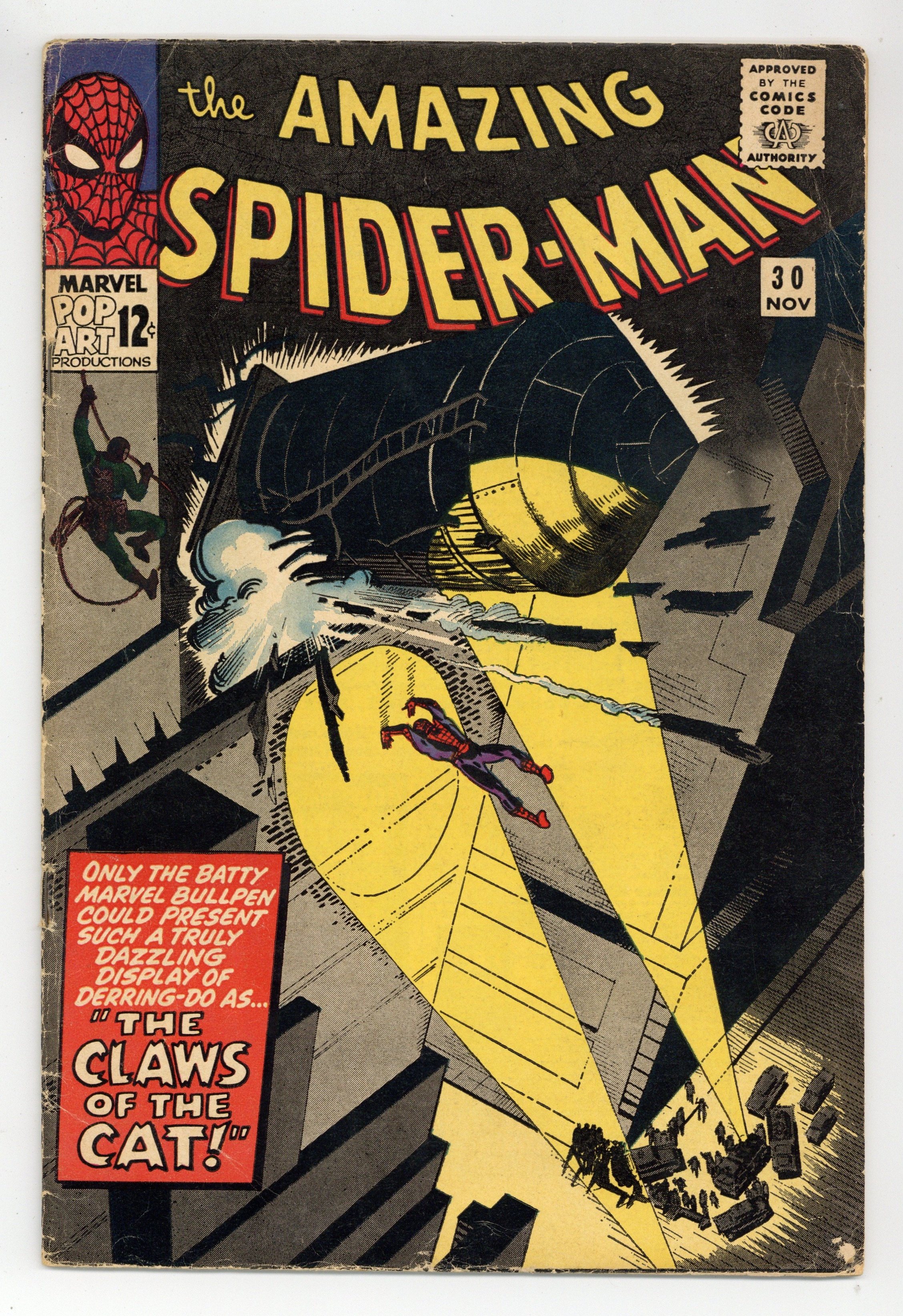 Starts Jan 26 Cover by Steve Ditko. First appearance of the Cat (not the same character who would be introduced in "The Cat" # 1 from 1972 who would later become Tigra). The Claws of the Cat!, script by Steve Ditko (plot) and Stan Lee (script), art by Steve Ditko; Jameson offers a thousand dollar reward for catching The Cat, and Spider-Man plans to collect; Betty tells Peter that Ned has asked her to marry him. Ad for Marvel T-Shirts. A letter from Jack C. Harris. Reprinted in Marvel Tales # 23 and 169. 36 pgs., full color. $0.12. Cover price $0.12.
