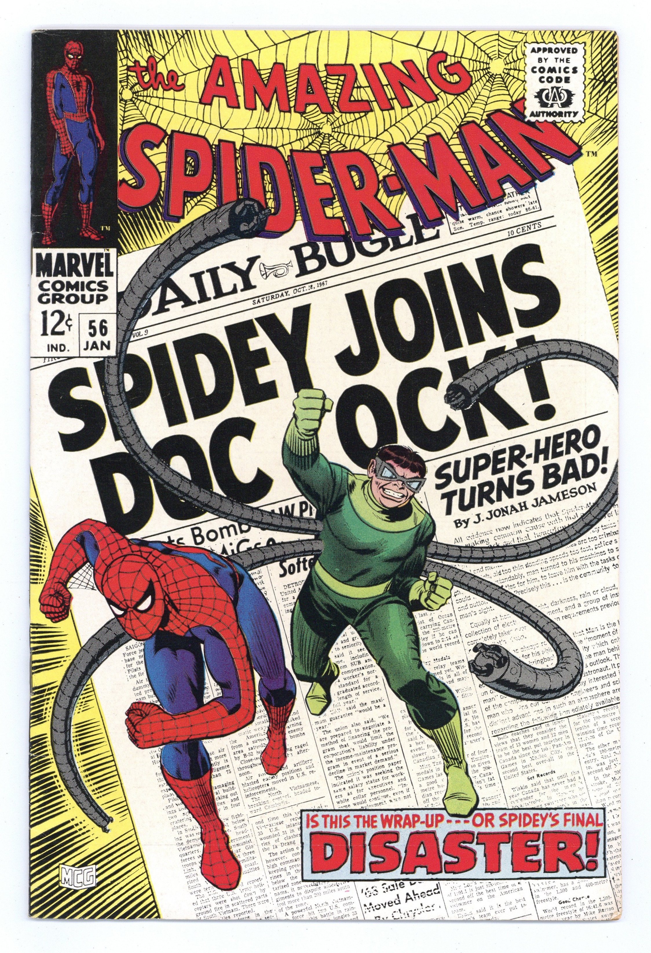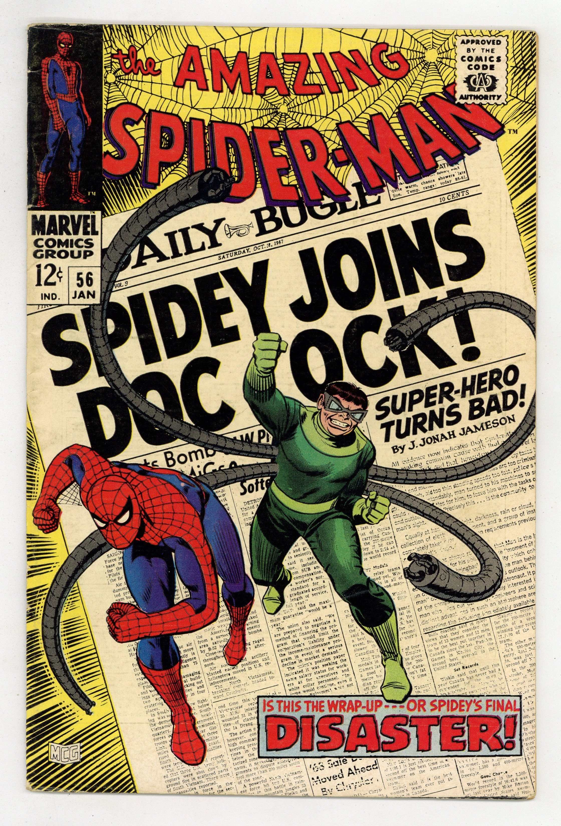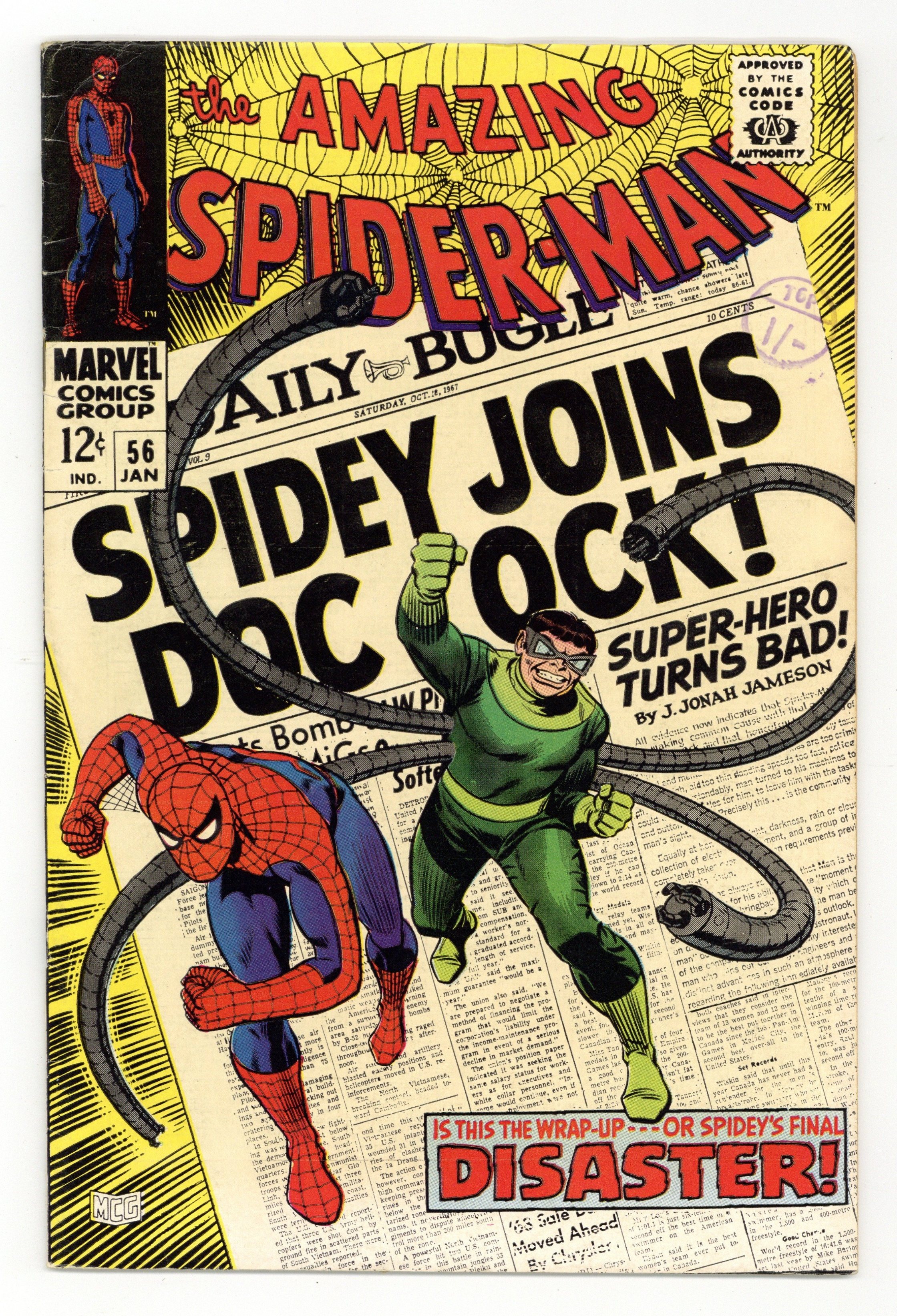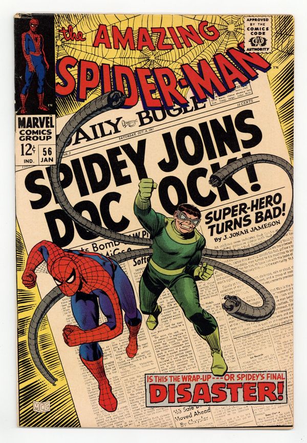 Starts Dec 15 Doctor Octopus appearance and the first appearance of Capt. Stacy in "Disaster" script by Stan Lee, pencils by John Romita Sr., inks by Mike Esposito as "Mickey Demeo." Spidey has amnesia, and Doc Ock convinces him that they are partners! Will he fall for it? Or just go along until his memory comes back? Romita cover. Reprinted in Marvel Tales # 41. 36 pgs. Cover price $0.12.