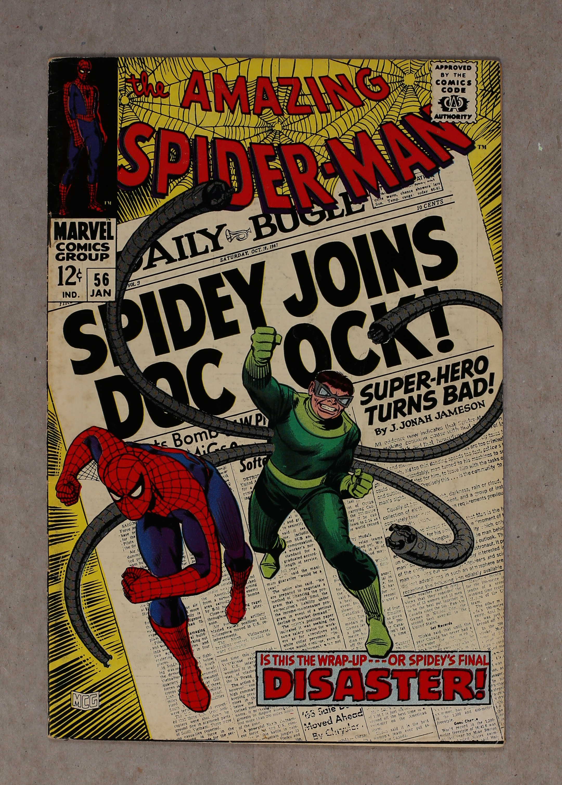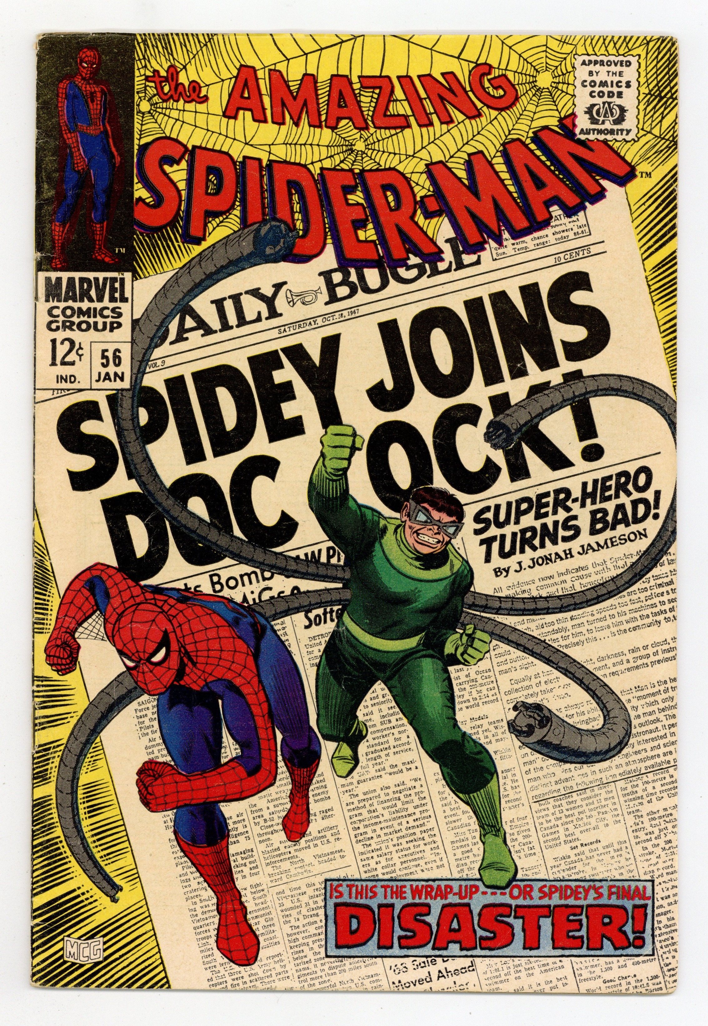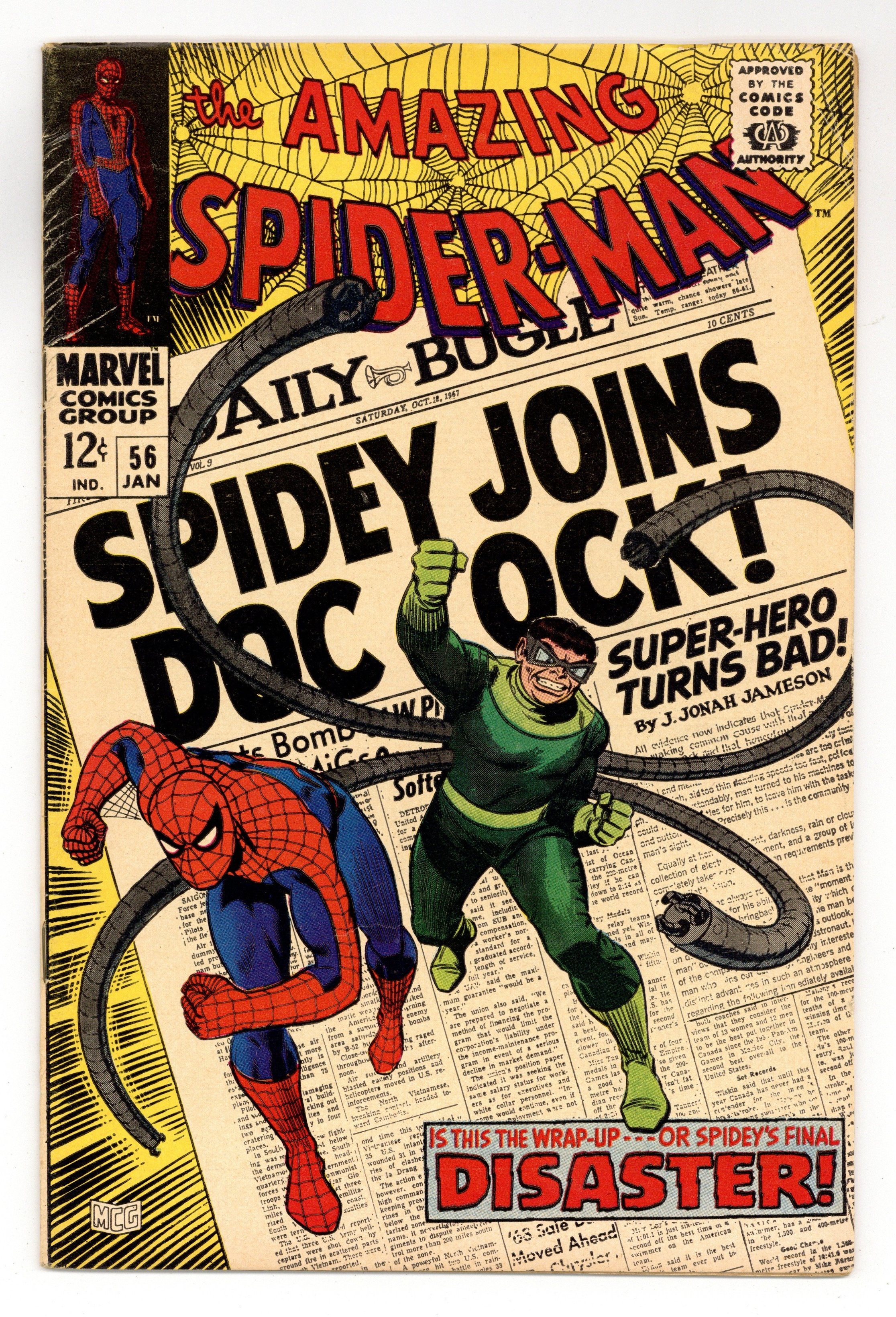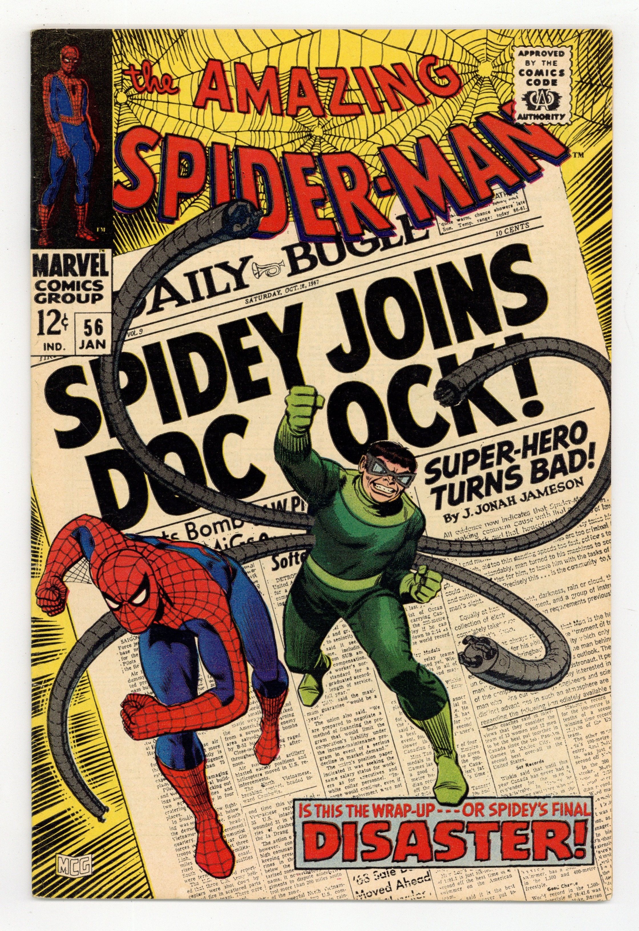 Starts Dec 15 Doctor Octopus appearance and the first appearance of Capt. Stacy in "Disaster" script by Stan Lee, pencils by John Romita Sr., inks by Mike Esposito as "Mickey Demeo." Spidey has amnesia, and Doc Ock convinces him that they are partners! Will he fall for it? Or just go along until his memory comes back? Romita cover. Reprinted in Marvel Tales # 41. 36 pgs. Cover price $0.12.