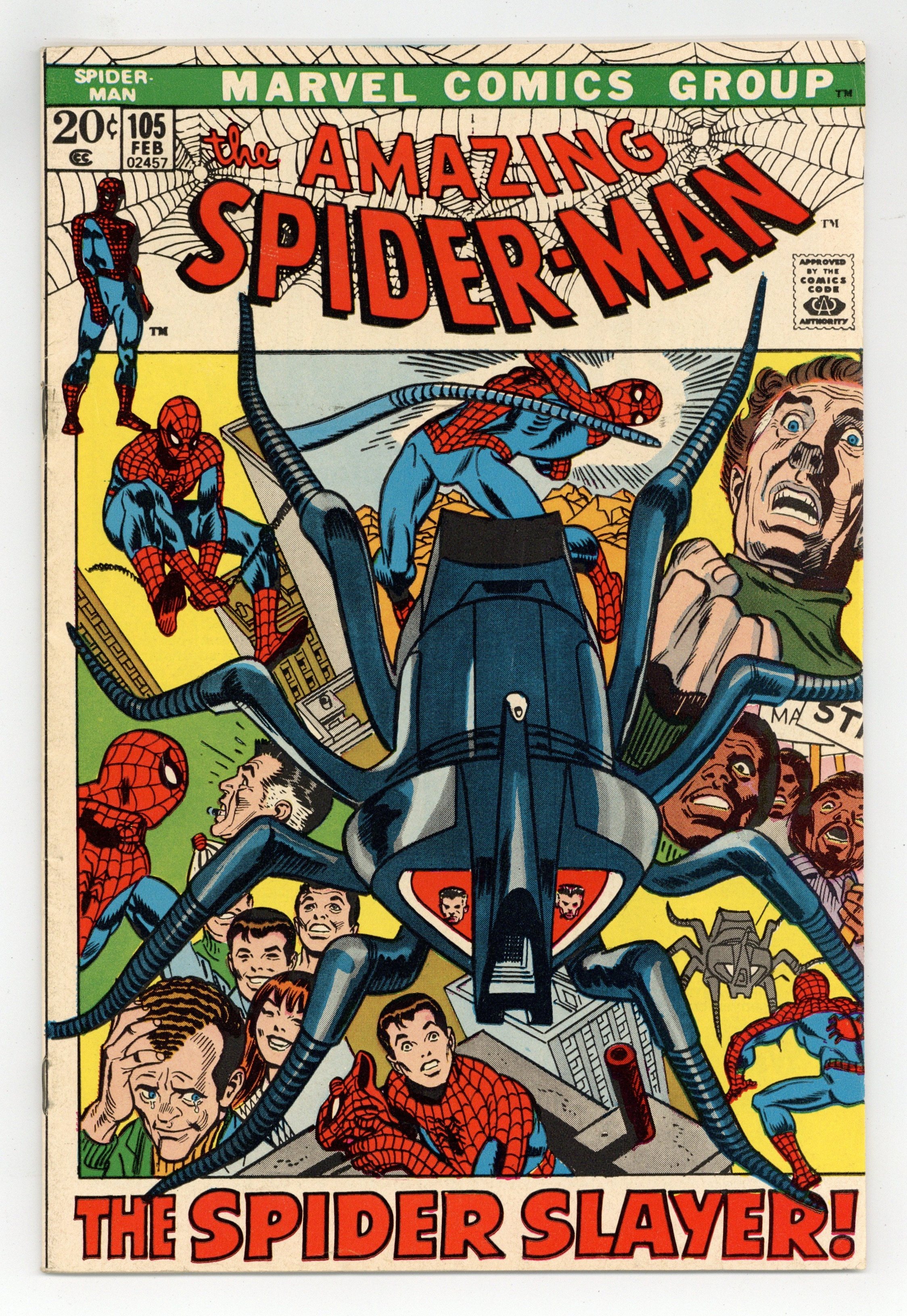 "The Spider Slayer!" Part 1 of 3. Script by Stan Lee. Pencils by Gil Kane. Inks by Frank Giacoia. Cover by Gil Kane and Frank Giacoia. Harry Osborn is out of the hospital after receiving treatment for his drug addiction. And to welcome Harry back to his apartment, Peter and Aunt Maythrow a party for him! Many of Harry's friends attend including Gwen, Mary Jane, and Flash Thompson -- plus Harry's father Norman. Meanwhile, J. Jonah Jameson meets with Spencer Smythe across town. Is Professor Smythe cooking up another spider slayer? Yes he is! And right at dusk the new and improved spider slayer attacks the web-slinger! Will this spider slayer live up to its name? Cameo appearances by Joe Robertson and Randy Robertson. (Notes: This issue is the first appearance of the spider slayer robot (Mark III) -- shaped like an actual spider. Spencer Smythe previously appeared in Amazing Spider-Man #58. This story was reprinted in Marvel Tales #84.) 36 pages. Cover price $0.20.