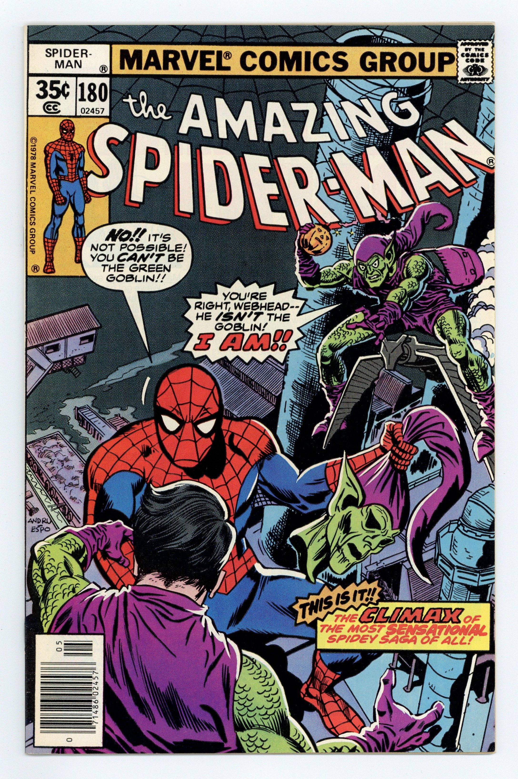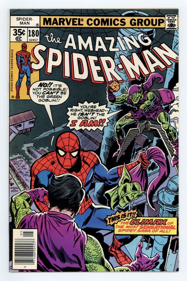 Tags: Marvel Legacy Numbering: Amazing Spider-Man (part 180), Spider-Man$75.00"Who Was That Goblin I Saw You With?" Part 5 of 5. Script by Len Wein. Art by Ross Andru (breakdowns) and Mike Esposito (finishes). Cover by Ross Andru and Mike Esposito. This is it! The awesome conclusion to the five-part goblin saga! At Radio City Music Hall, the Green Goblin emerges triumphant! And the devious purple and green villain flies to an incinerating plant in Brooklyn to throw the unconscious web-slinger into a smokestack! But the spectacular one wakes up just in time! And the final donnybrook between the Green Goblin and the Amazing Spider-Man begins! The wall-crawler is in control of the battle...until a second goblin arrives on the scene! What?! Who? The web-slinger watches in shock as the battle of the goblins unfolds! Can Harry Osborn exorcise the demons of his past? And somehow return to a normal life? An uplifting story! Final appearance of Dr. Bart Hamilton. Cameo appearances by Silvermane, J. Jonah Jameson, Joe Robertson, and Liz Allan. Flashback cameos by Harry Osborn and the Spider-clone. (Notes: More than a decade passes before Harry Osborn becomes the Green Goblin again in Amazing Spider-Man 312. The incinerating plant in this story is the same one where the web-slinger disposed of his clone in Amazing Spider-Man 151. Silvermane returns in Spectacular Spider-Man Annual 2. This issue concludes Len Wein's terrific two-and-a-half year run as the writer of the Amazing Spider-Man title.) 32 pages. Cover price $0.35.