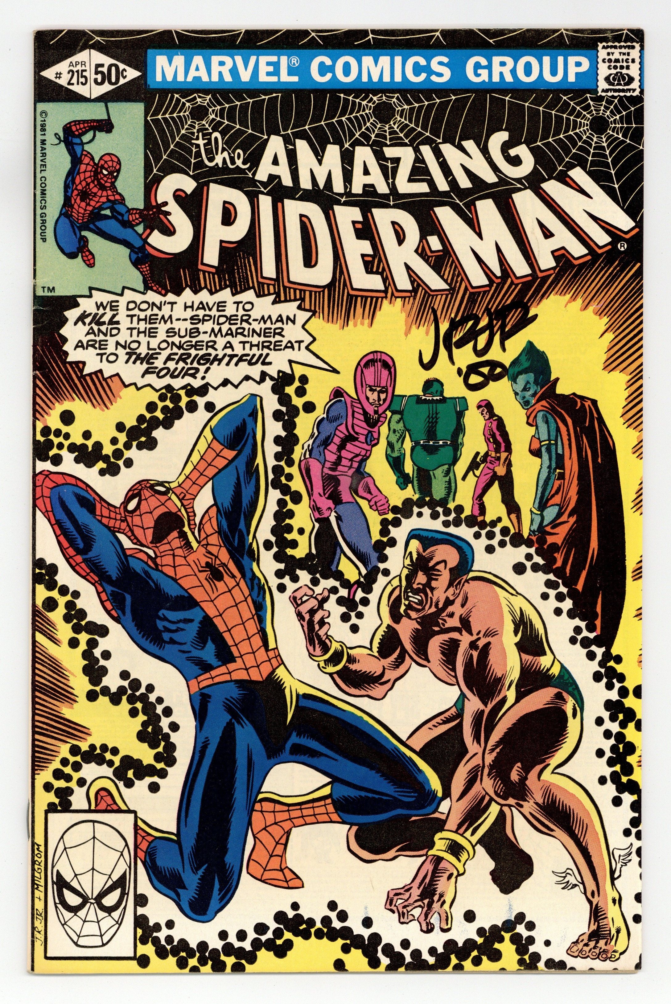Direct Edition. "By My Powers Shall I Be Vanquished!" Part 3 of 3. Guest-starring the Sub-Mariner. Script by Denny O'Neil. Art by John Romita Jr. (breakdowns) and Jim Mooney (finishes). Cover by John Romita Jr. and Al Milgrom. In a diabolical twist of fate, the Wizard transfers Spider-Man's spider-sense into the mind of the Sub-Mariner! The web-slinger's sudden loss and Prince Namor's sudden gain make them easy prey for the Frightful Four! After taking a beating, the two heroes go their separate ways to lick their wounds! Hours later they rendezvous at the Baxter Building to reverse the Wizard's experiment! And then it's time for payback! The Spectacular Spider-Man and the Avenging Son vs. the Frightful Four! Imperious Rex! A terrific three-part story! Cameo appearances by the Invisible Girl, Mr. Fantastic, and the Thing. (Notes: This O'Neil-Romita Jr.-Mooney collaboration is the signature Spider-Man & Sub-Mariner team-up of the bronze age. This issue includes a 3/4 page ad (by Frank Miller) for the Doctor Strange 2nd series; however, another artist ended up penciling the title. The letters page contains a statement of ownership: average print run 609,059; average paid circulation: 296,712. 36 pgs. Cover price $0.50.