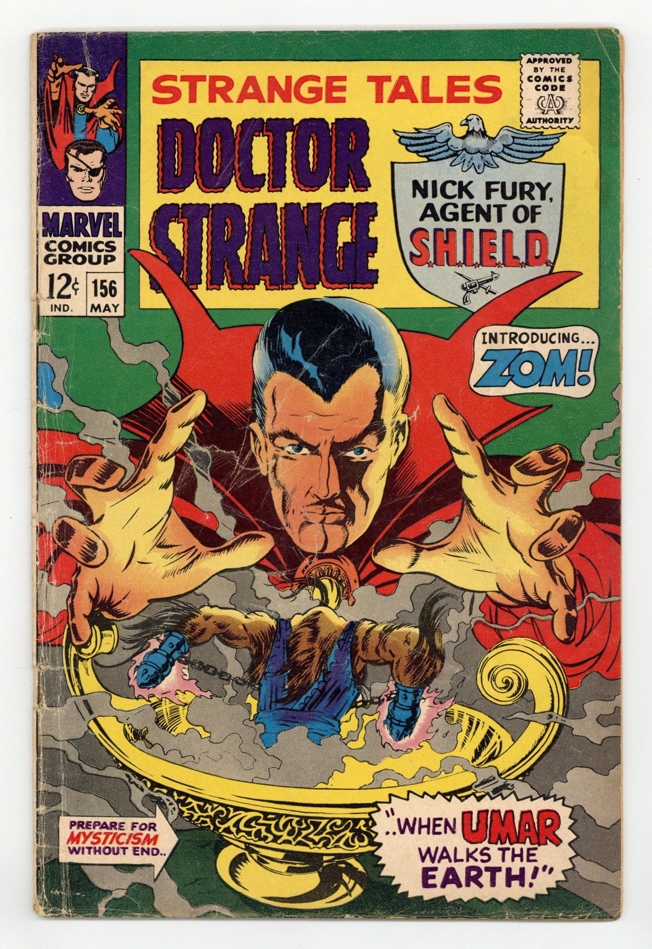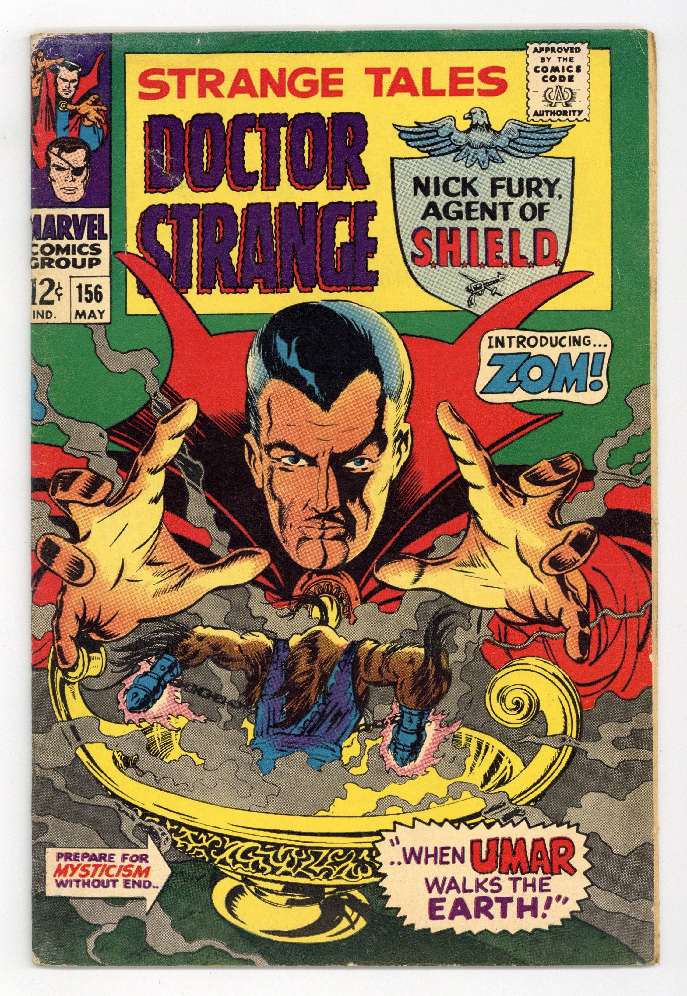 Cover art by Marie Severin. Nick Fury stars in "The Tribunal!", script and art by Jim Steranko; Fury's quarters are destroyed, apparently killing him! Bronson heads for Hydra Island, a futuristic, hi-tech fortress in the Pacific resuming his guise as Supreme Hydra; He announces to the world that he's placed a Death Spore bomb on board the Heli-Carrier which will unleash a plague upon the entire Earth!; He plans to stage a fake trial for Laura, as an example to all who would defy him; Cameos by the Fantastic Four, Spider-Man, Daredevil, Thor, Captain America, Hawkeye, the Scarlet Witch, the X-Men (Professor X, Cyclops, Marvel Girl, the Angel, the Beast, Iceman), Iron Man, the Hulk, Wasp, and Goliath (of the Avengers). "Umar Walks the Earth!", script by Stan Lee and Marie Severin (co-plot), art by Marie Severin; The Ancient One sends Doctor Strange to the Amphora, a large vase guarded by fiery demons in order to free Zom, a being imprisoned by Eternity; Umar comes to earth, destroys Strange's house and summons The Ancient One; Strange unleashes Zom who he persuades to follow him to Earth. Merry Marvel Marching Society info and coupon. 36 pgs., full color. Cover price $0.12.