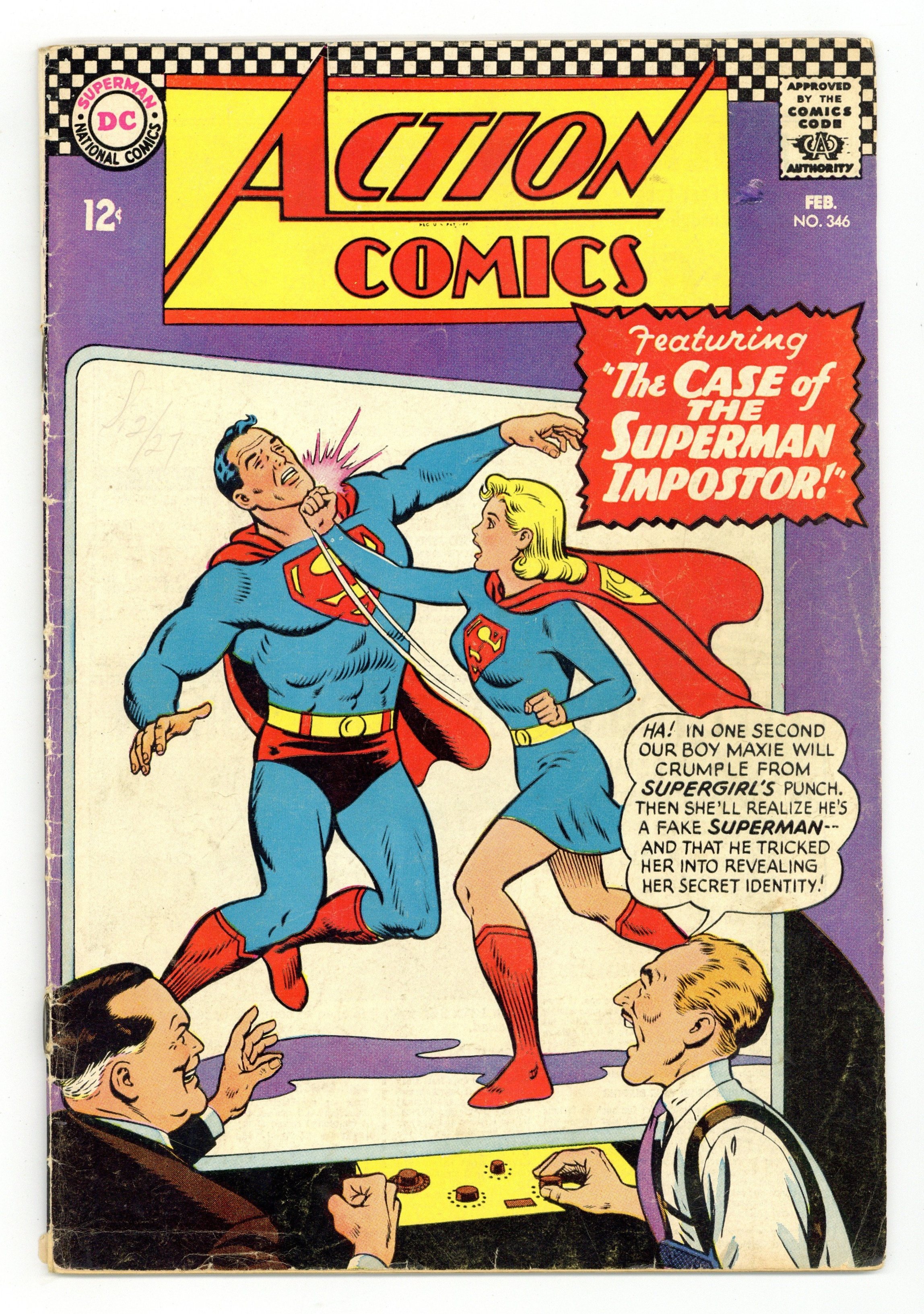 Cover pencils by Curt Swan, inks by George Klein. "The Man Who Sold Insurance to Superman!", script by Leo Dorfman, art by Wayne Boring; Insurance salesman Terry Mason will only be allowed to marry the boss's daughter if he can sell a $100 billion life insurance policy to Superman. Sgt. Rock's 6 Battle Stars ad. Letter to the editor from writer Mark Evanier. This issue also contains a statement of ownership - average print run 754,000; average paid circulation 491,135. "The Case of the Superman Impostor!", script by Robert Bernstein, pencils by Jim Mooney, inks by Al Plastino; The Professor has deduced that Superman is Clark Kent and he tricks Supergirl into confirming the fact, using a henchman who has been transformed into a double for Superman by plastic surgery. 36 Pages, Full Color. $0.12 Cover price $0.12.