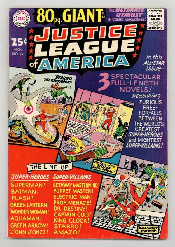 Cover pencils by Mike Sekowsky, inks by Murphy Anderson and Bernard Sachs. Reprints. Starro the Conqueror, script by Gardner Fox, pencils by Mike Sekowsky, inks by Bernard Sachs. Starro vs. Green Lantern, script by Gardner Fox, pencils by Mike Sekowsky, inks by Joe Giella. Starro vs. Wonder Woman and John Jones, Manhunter from Mars, script by Gardner Fox, pencils by Mike Sekowsky, inks by Bernard Sachs. Starro vs. the Flash!, script by Gardner Fox, pencils by Mike Sekowsky, inks by Murphy Anderson. Starro vs. Justice League of America, script by Gardner Fox, pencils by Mike Sekowsky, inks by Bernard Sachs. Case of the Stolen Super-Powers!, script by Gardner Fox, pencils by Mike Sekowsky, inks by Bernard Sachs. When Gravity Went Wild!, script by Gardner Fox, pencils by Mike Sekowsky, inks by Bernard Sachs. Half-page index of the first 39 issues. Rocky and Bullwinkle star in a one-page Cheerios ad. 84 pgs. $0.25. Cover price $0.25.