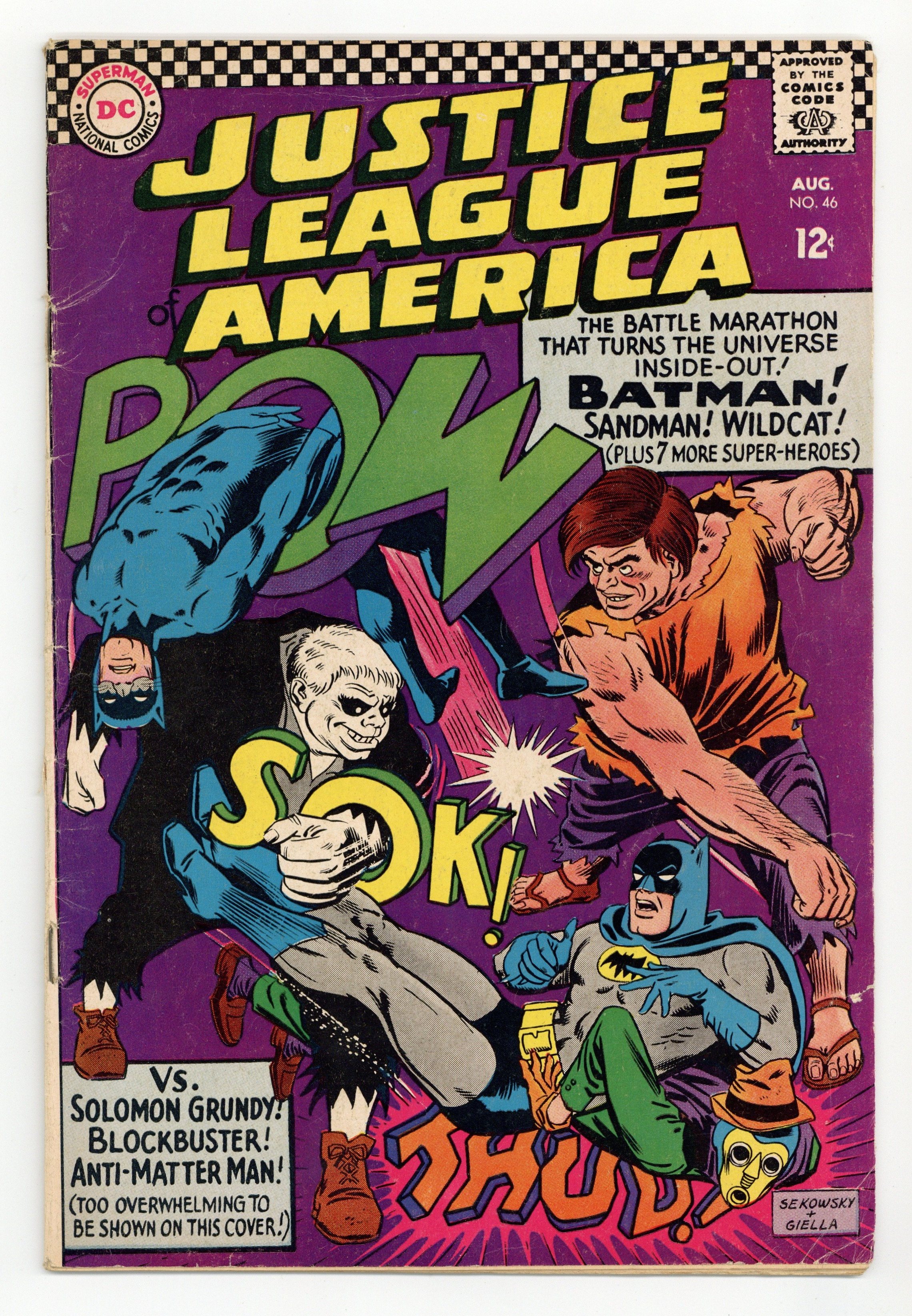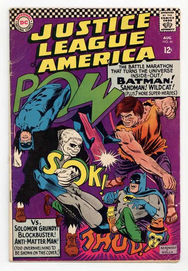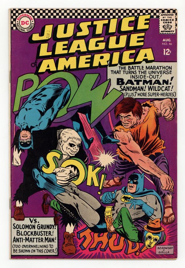 1st appearance of Silver Age Sandman. Cover pencils by Mike Sekowsky, inks by Joe Giella. Crisis Between Earth-One and Earth-Two!, script by Gardner Fox, pencils by Mike Sekowsky, inks by Sid Greene; People from Earth-1 and Earth-2 are being inexplicably transferred from one parallel world to the other, including Blockbuster and Solomon Grundy; At the same time, the Spectre discovers that the approach of the Anti-Matter Man is the reason for the transfers and will eventually cause the destruction of both worlds. 1st appearance of Silver Age Sandman. Cap's Hobby Hints by Henry Boltinoff. The Policeman Is Your Friend! public service announcement by Jack Schiff. 36 pgs. $0.12. Cover price $0.12.